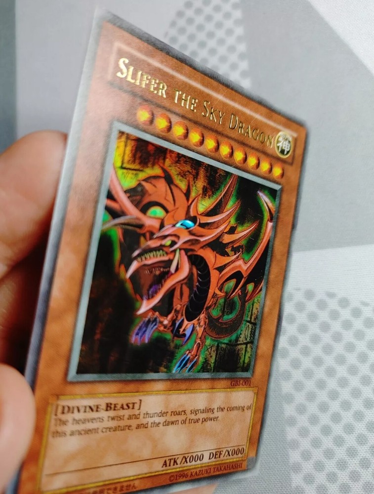 YuGiOh Slifer the Sky Dragon GBI-001 Ultra Rare Promo 2003 KONAMI. Not in bad shape has some scratches and the right corner has a tiny crease.