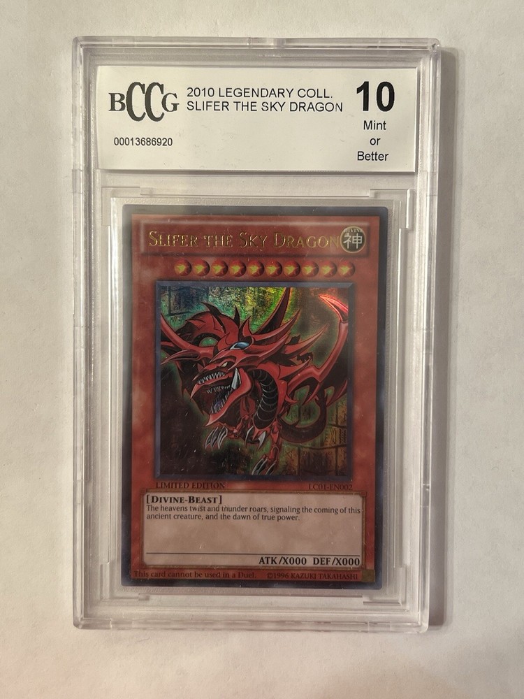 The product is a Yu-Gi-Oh! Trading Card Game Limited Edition card featuring Slifer the Sky Dragon from the Yu-Gi-Oh! Legendary Collection set. Manufactured in 2013, this collectible card game item is of high value due to its rarity and association with popular characters like Seto Kaiba and Yami Yugi. With a holo finish and made of paper, this monster card is a sought-after addition to any collector's deck. Its limited edition status adds to its exclusivity and desirability among fans of the Yu-Gi-Oh! franchise.