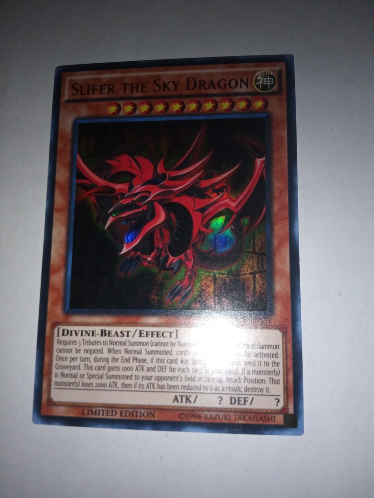 This limited edition ultra rare card features the divine beast Slifer the Sky Dragon from the Yu-Gi-Oh! TCG. The card is perfect for collectors and players alike, with its vintage rarity and unique features. The attributes of the card include divine color and monster card type, while the creature/monster type is divine-beast. Get your hands on this rare and sought-after card today!