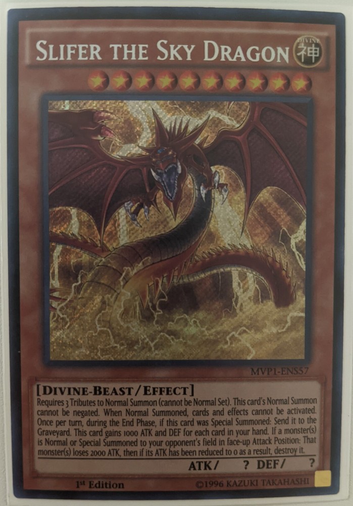 You are buying a Secret Rare, 1st Edition Slifer the Sky Dragon from MVP1-ENS57. Feel free to contact us if you have any Questions or Comments and we will get back to you ASAP. Our postage options: Domestic: Standard (Cheapest option) Domestic Tracked Letter (Tracked) Express (Tracked, fastest delivery) International: We currently only have Express and Registered (untracked with signature) postage due to delays caused by the current pandemic however if you interested in purchasing an item through Standard International Postage (Untracked) feel free to contact us. If you would like to combine postage over multiple items but are unable to please select the request total button or send us a message and we can help you out. Thanks for shopping with ChaosTCGAus! We Hope to see you again