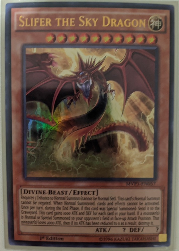 You are buying an Ultra Rare, 1st Edition Slifer the Sky Dragon from MVP1-EN057. Feel free to contact us if you have any Questions or Comments and we will get back to you ASAP. Our postage options: Domestic: Standard (Cheapest option) Domestic Tracked Letter (Tracked) Express (Tracked, fastest delivery) International: We currently only have Express and Registered (untracked with signature) postage due to delays caused by the current pandemic however if you interested in purchasing an item through Standard International Postage (Untracked) feel free to contact us. If you would like to combine postage over multiple items but are unable to please select the request total button or send us a message and we can help you out. Thanks for shopping with ChaosTCGAus! We Hope to see you again
