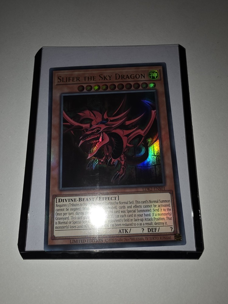 Elevate your Yu-Gi-Oh! TCG collection with the legendary Slifer the Executive Producer card, a must-have for any serious duelist. This Ultra Rare - Yugi - card, numbered LDK2-ENS01, is a limited edition piece that embodies the essence of power and prestige in the realm of Yu-Gi-Oh!With its rich English lore and the might of a Monster card type, Slifer the Sky Dragon is not just a playable piece but a collectable that resonates with the spirit of the game. It's an essential addition to your deck, providing not only strategic value but also a touch of rarity that stands out.