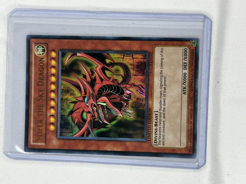 This is a limited edition Ultra Rare card from the Yu-Gi-Oh! TCG set, Yugi's Legendary Decks. The card name is Slifer the Sky Dragon, which is a powerful Divine-Beast creature with X000 attack and X000 defense. This card is a must-have for any collector or player of the game, especially those who appreciate the rarity and value of Ultra Rare cards. The card number is YGLD-ENG01 and it features the iconic Egyptian God design. Get your hands on this amazing card today!