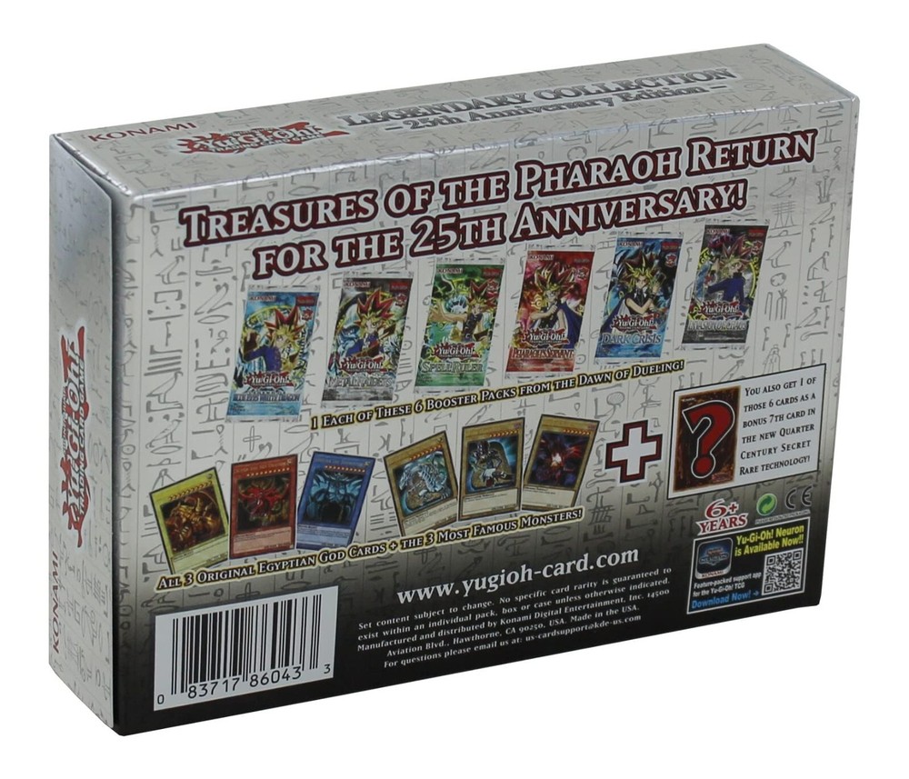 About this item Treasures of the Pharaoah return for the 25th anniversary! Each collector's set includes 6 packs (Legend of blue eyes white dragon, Metal Raiders, Spell Ruler, pharaoh's Servant, Dark Crisis, and Invasion of Chaos), 6 ultra rare cards (Obelisk the Tormentor, Slifer the Sky Dragon, the winged dragon of ra, blue-eyes white dragon, dark magician, and red-eyes black dragon) Each set also includes 1 quarter century-secret rare version of 1 of 6 possible cards