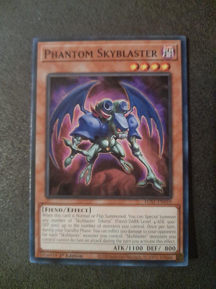 This Yu-Gi-Oh! TCG card features the powerful Phantom Skyblaster, an Egyptian God Deck card with the card number EGS1-EN010. The card is made from high-quality card stock material and has a regular finish. It is a 1st edition card and is in English language. The card is perfect for collectors and players alike, with its unique features and rarity. It belongs to the CCG Individual Cards and Collectible Card Games categories, and is suitable for kids aged 6+. The card is in excellent shape and is sure to be a valuable addition to any collection.