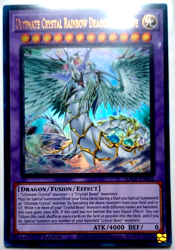 YuGiOh⚡ TCG 💎 Ultimate Crystal Rainbow Dragon Overdrive 💎 SDCB Rare Experience the ultimate power of the Egyptian Gods with the Slifer the Sky Dragon card from the Yu-Gi-Oh! TCG. This ultra-rare card features a stunning foil finish and depicts the mighty dragon alongside iconic characters like Yami Yugi and Seto Kaiba. With its powerful effect and versatile attributes, this card is a must-have for any collector or player. Summon warriors, fiends, spellcasters, and dragons to your side and dominate the game with the Ultimate Crystal Rainbow Dragon Overdrive. Crafted from premium card stock and manufactured by Konami, this card is built to last and stand the test of time. Don't miss out on the chance to add this amazing card to your collection today!