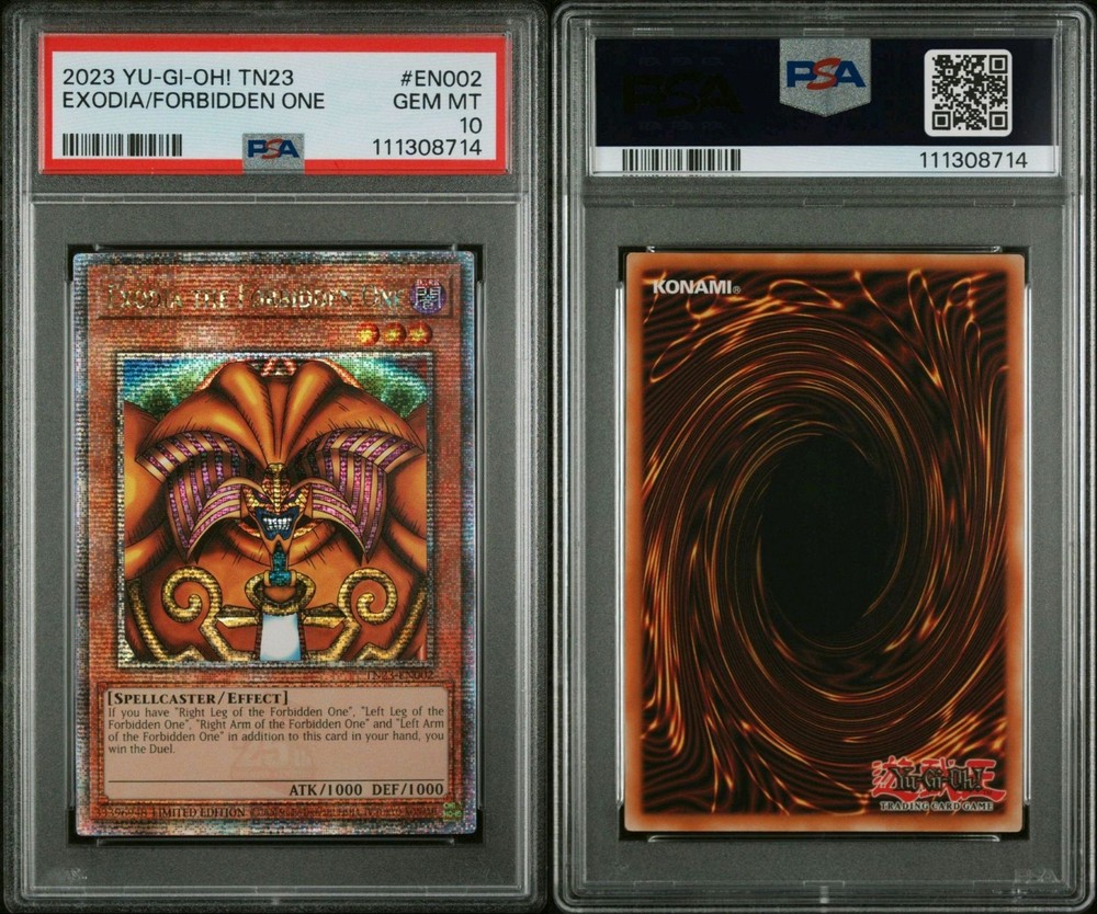 Yu-Gi-Oh! TCG – PSA 10 Exodia the Forbidden One [Quarter Century Secret Rare] – 2023 Available for sale is the legendary Exodia the Forbidden One, released in 2023 as a Quarter Century Secret Rare, professionally graded PSA 10 (Gem Mint). This stunning card celebrates 25 years of Yu-Gi-Oh! with dazzling foil treatment and one of the most iconic monsters in TCG history. Open to reasonable offers. Whether you're a longtime Yu-Gi-Oh! fan, a collector of iconic monsters, or assembling a pristine Quarter Century set—this Exodia is a centerpiece-worthy addition to your collection. Card Highlights: ✔ Card Name: Exodia the Forbidden One ✔ Card Number: TN23-EN002 ✔ Grade: PSA 10 (Gem Mint) ✔ Edition: Limited Edition ✔ Rarity: Quarter Century Secret Rare Shipping & Protection: ✅ Insured Shipping via USPS (with tracking) ✅ Securely stored in a protective plastic sleeve ✅ Wrapped in bubble wrap & placed in a durable bubble envelope for maximum protection Kiddos and I are selling extra cards from our collection that we had graded. Feel free to reach out with any questions or if you'd like more pictures.