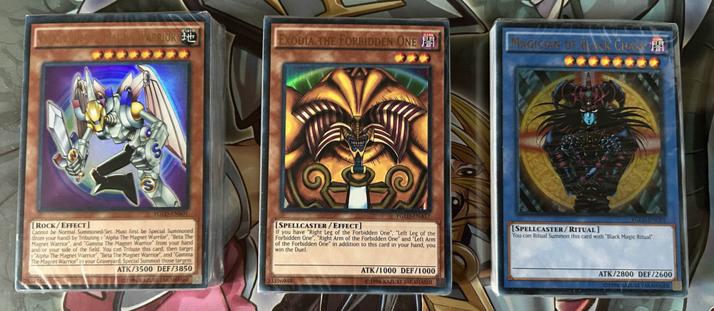 One complete sealed set of the 3 Yu-Gi-Oh! TCG Legendary Decks 1 decks containing all the following cards; Magician of Black Chaos Dark Magician of Chaos Gandora the Dragon of Destruction Silent Magician LV8 Silent Magician LV4 Silent Swordsman LV7 Silent Swordsman LV5 Silent Swordsman LV3 Dark Magician Dark Magician Girl Buster Blader The Tricky Jack's Knight Queen's Knight King's Knight Green Gadget Red Gadget Yellow Gadget Skilled Dark Magician Skilled White Magician Blockman Marshmallon Kuriboh Monster Reborn Swords of Revealing Light Gold Sarcophagus Card of Sanctity Polymerization Dark Magic Attack Magicians Unite Dedication through Light and Darkness Black Magic Ritual Tricky Spell 4 Emblem of Dragon Destroyer Marshmallon Glasses Mirror Force Magician's Circle Shattered Axe Stronghold the Moving Fortress Miracle Restoring Dark Paladin Black Luster Soldier Black Luster Soldier - Envoy of the Beginning Dark Magician Dark Magician Girl Gaia the Fierce Knight Summoned Skull Curse of Dragon Catapult Turtle Celtic Guardian Winged Dragon, Guardian of the Fortress #1 Feral Imp Beaver Warrior Griffore Mystical Elf Giant Soldier of Stone Mammoth Graveyard Exodia the Forbidden One Right Leg of the Forbidden One Left Leg of the Forbidden One Right Arm of the Forbidden One Left Arm of the Forbidden One Kuriboh Monster Reborn Swords of Revealing Light Mystic Box Brain Control Monster Recovery Spell Shattering Arrow Horn of the Unicorn Mystical Moon Burning Land Multiply Detonate Makiu, the Magical Mist Polymerization Black Luster Ritual Mirror Force Magical Hats Shift The Eye of Truth Gaia the Dragon Champion Valkyrion the Magna Warrior Dark Magician Dark Magician Girl Buster Blader Archfiend of Gilfer Jack's Knight Queen's Knight King's Knight Berfomet Gazelle the King of Mythical Beasts Alpha the Magnet Warrior Beta the Magnet Warrior Gamma the Magnet Warrior Big Shield Gardna Kuriboh Monster Reborn Swords of Revealing Light Dark Magic Curtain Thousand Knives Magic Formula Magical Dimension Diffusion Wave-Motion Double Spell Ectoplasmer Soul Taker Pot of Greed Card Destruction Exchange Monster Recovery Polymerization De-Fusion Multiply Mirror Force Magical Hats Magic Cylinder Spellbinding Circle Lightforce Sword Chain Destruction Soul Rope Tragedy Chimera the Flying Mythical Beast This collection will be sent via Royal Mail and will be properly protected. Please check out my other listings and don't hesitate to contact me with any inquiries. Always willing to take further photographs of specific card listings when requested and will work with you to create multiple listing discounts etc.