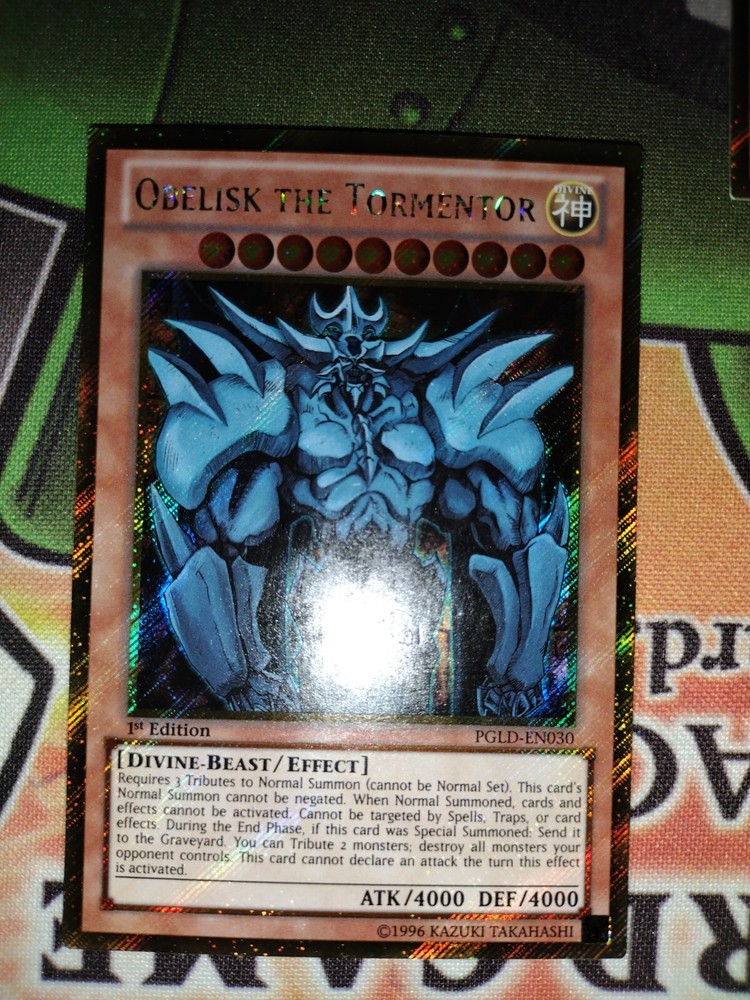 slifer the sky dragon, obelisk the tormentor, and the winged dragon of ra from pgld l.p. to n.m. condition see pictures all 1st edition...