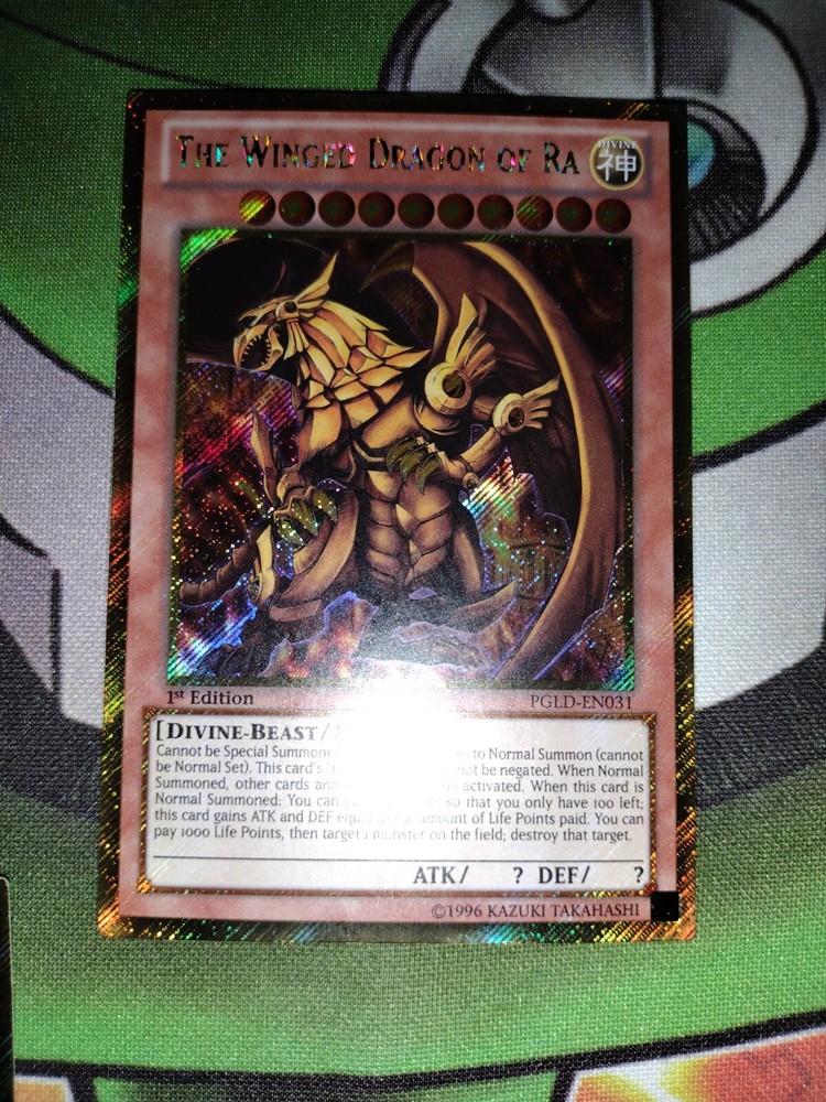slifer the sky dragon, obelisk the tormentor, and the winged dragon of ra from pgld l.p. to n.m. condition see pictures all 1st edition