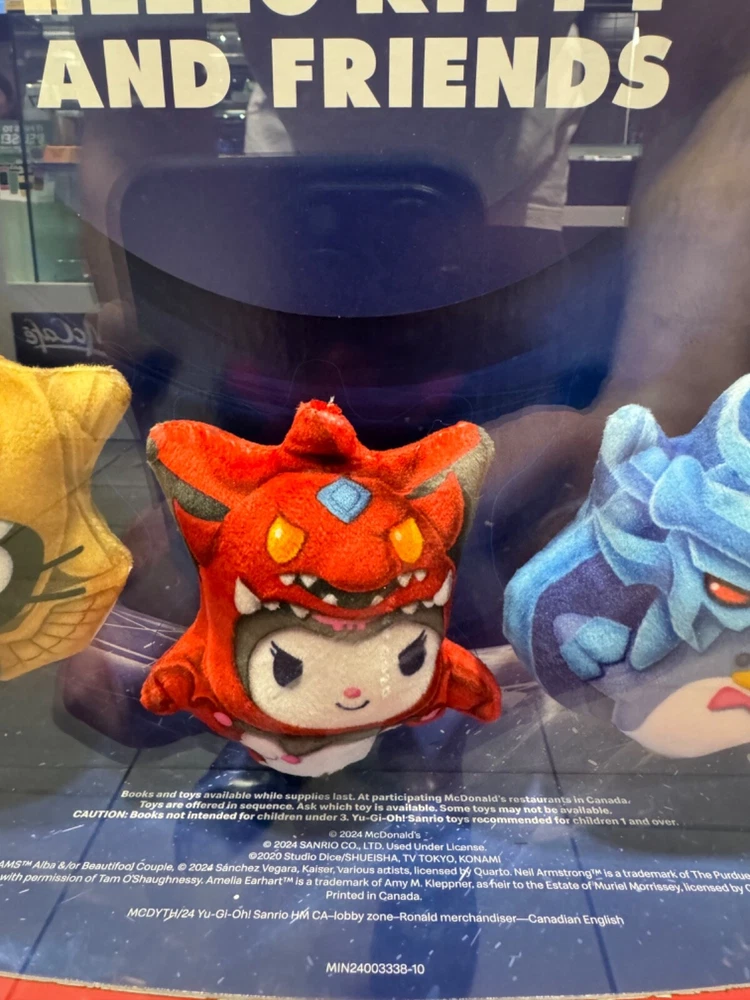 Title: McDonald's x Yu-Gi-Oh! Plush Toy Set - Limited Edition Description: Introducing the McDonald's x Yu-Gi-Oh! plush toy set, a must-have for collectors and kids alike! Characters available are: - My Melody as Dark Magician Girl - Tuxedosam as Obelisk the Tormentor - Kuromi as Slifer the Sky Dragon - Chococat as The Winged Dragon of Ra - Hello Kitty as Dark Magician - Cinnamoroll as Blue-Eyes White Dragon - Keroppi as Kuriboh - Pompompurin as Exodia the Forbidden One - Pochacco as Time Wizard - Badtz-maru as Red-Eyes Black Dragon PLEASE READ PRIOR TO PURCHASING: Take part in our special deal! Buy 2 for a 5% discount, 3 for a 10% discount, and 4 for a 15% discount! For each additional item, add $1 USD to cover combined shipping costs . You will receive the characters you selected and checked out with in your cart. Please note that this is not the entire set. As these are McDonald's products, the packaging may have minor defects or imperfections such as marks, scratches, or tiny dents. We will make every effort to avoid shipping boxes that aren't in perfect condition , but in rare instances please understand that these packages may have minor flaws from the factory that are beyond our control. If you are a collector and particular about the condition, and if you intend to display them in your sealed collection, please message us for photos before we ship to ensure your satisfaction and to avoid any issues. We'll take every precaution to prevent damage during transit, ensuring your item arrives in factory-new condition. While supplies last Each plush toy is brand new and straight from the Canadian McDonald's promotion and will be shipped from Canada to your home as quickly as possible! Rest assured, I take great care in packaging to ensure these adorable plushies arrive safely to their new home. Don't miss out on this limited edition collaboration! Add these charming characters to your collection or surprise a Yu-Gi-Oh! fan today!