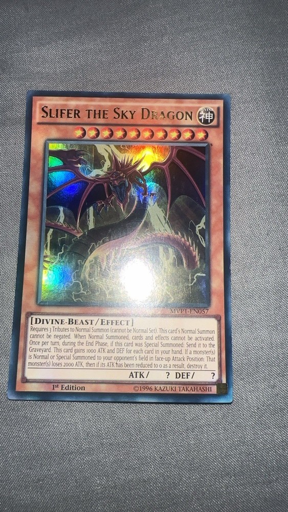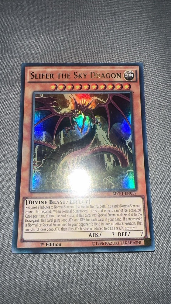 Elevate your Yu-Gi-Oh! TCG collection with the iconic Slifer The Sky Dragon card, a must-have for both serious collectors and duellists. With its impressive holographic design, this Ultra Rare card from the Morpho Series is a standout piece, showcasing the formidable power of the legendary Sky Dragon. Card number MVP1-EN057, this effect-type creature is a true asset in battle, providing strategic advantage to players. Expertly crafted by Konami, Slifer The Sky Dragon comes as a 1st Edition, ensuring its rarity and value. The card adheres to the Japanese card size standard, fitting seamlessly into any deck or display. Its limited edition status makes it a unique addition to any collection, beckoning those who appreciate the depth and history of the Yu-Gi-Oh! universe.