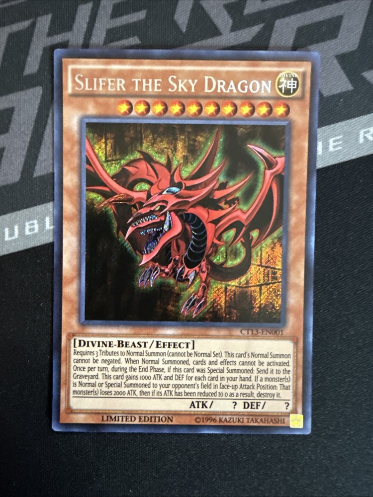 The Yugioh 2016 Slifer The Sky Dragon Limited Ed. CT13-EN001 card is a highly sought-after collectible for fans of the Yu-Gi-Oh! TCG. This speciality SP card features the character Yami Yugi and belongs to the Battle of Chaos set. As a Divine attribute dragon card made by Konami, it is a rare vintage piece with a 10000 Secret Rare rarity level. This limited edition card has a holographic finish and is part of the Ultimate stage in the game. With its near mint condition, this card would be a valuable addition to any collector's deck.