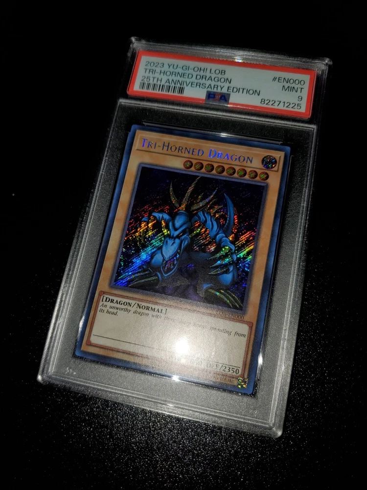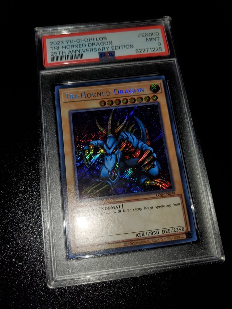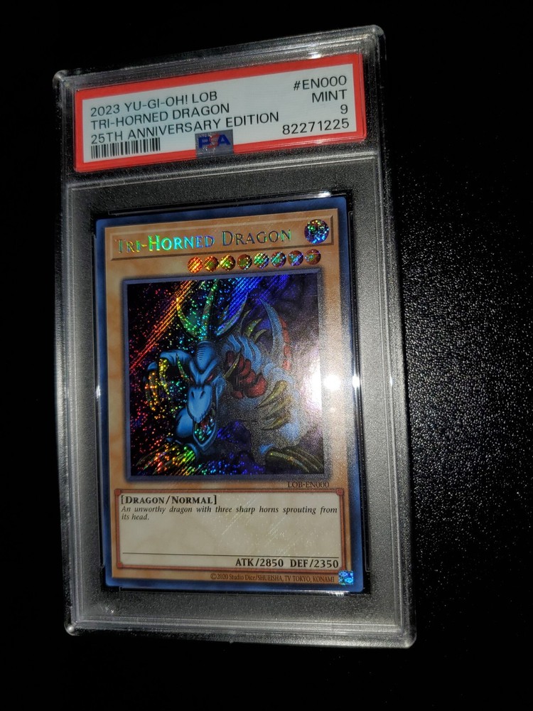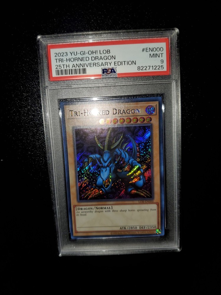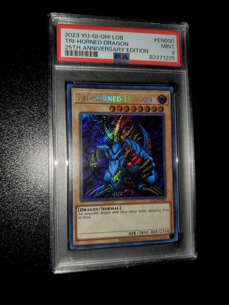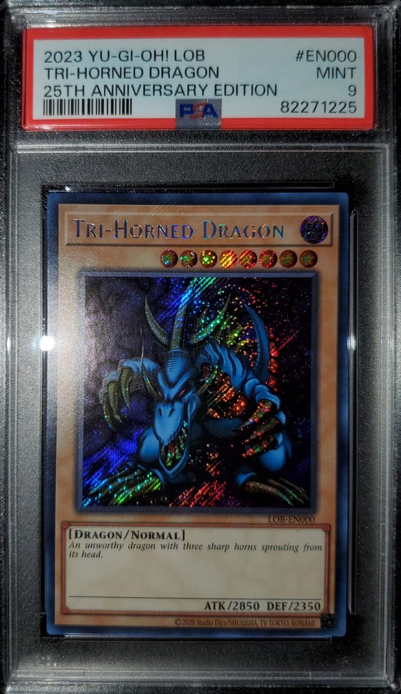Yugioh 2023 Tri-Horned Dragon LOB-EN000 PSA 9 Will ship safely & securely. Slab is fitted tight and firmly in a perfect fit plastic sleeve. Placed in small 4x6 bubble mailer that will be sandwiched in between 2 large cuts of cardboard. Further encased in a larger brighter 6x10 bubble mailer to ensure perfect protection during shipment and to retain visibility to USPS workers reducing the possibility of missing packages. As a long time seller on eBay, I want every order placed with me to arrive timely and safely. You are entrusting me with your hard earned money and I will not only meet, but surpass your trusted expectations. Feel free to message for further pictures or questions