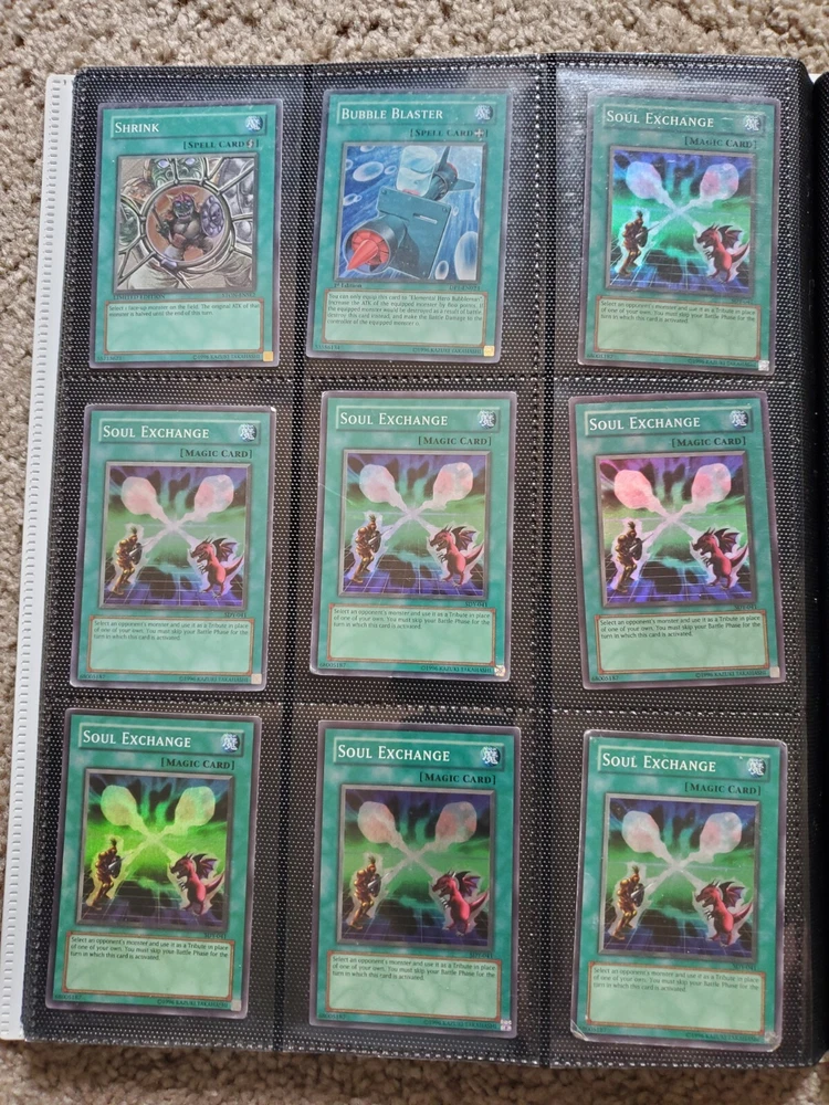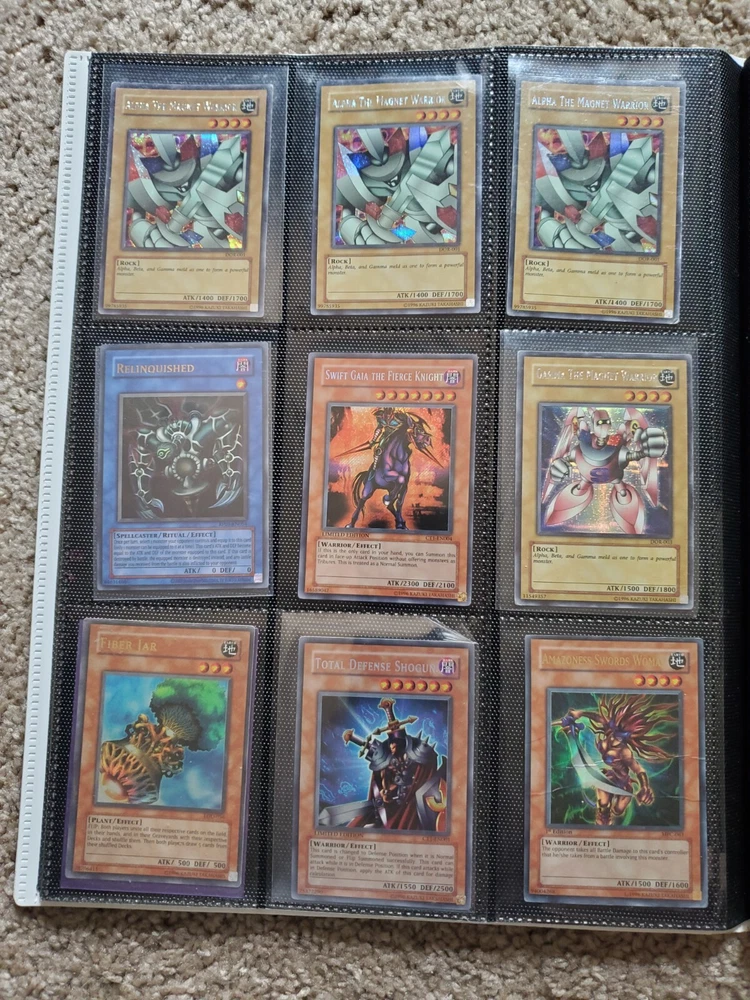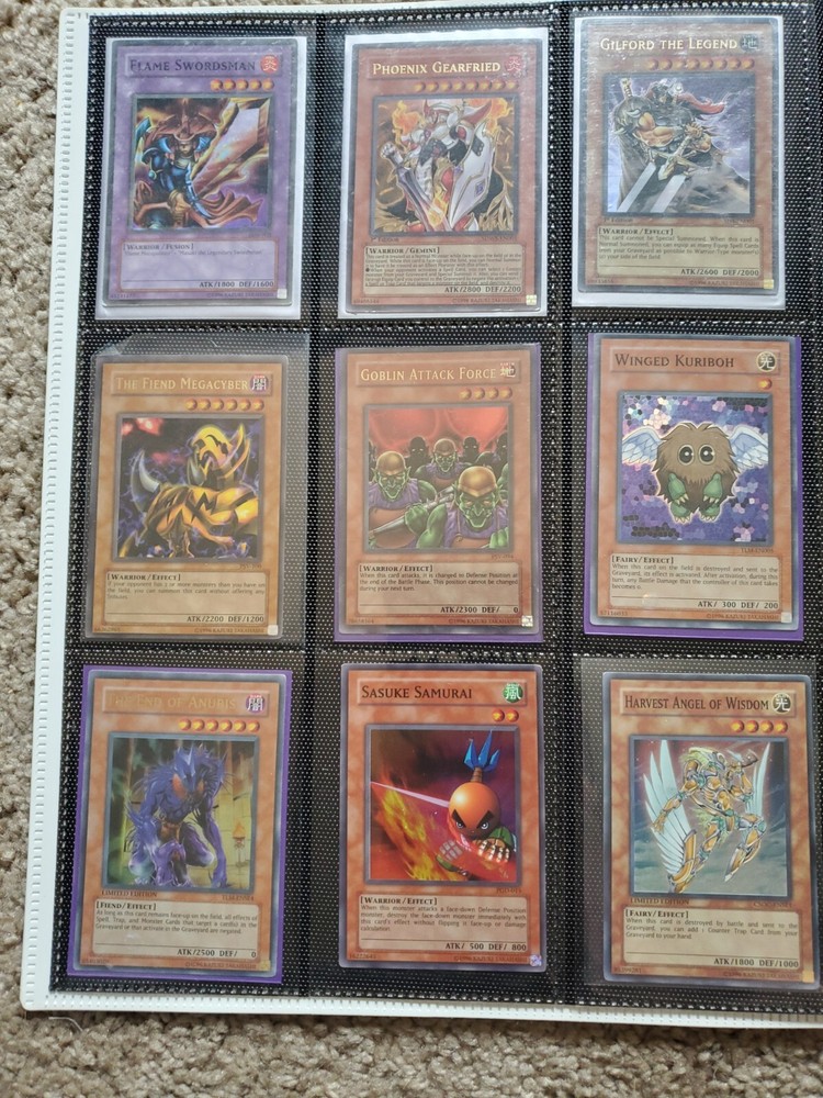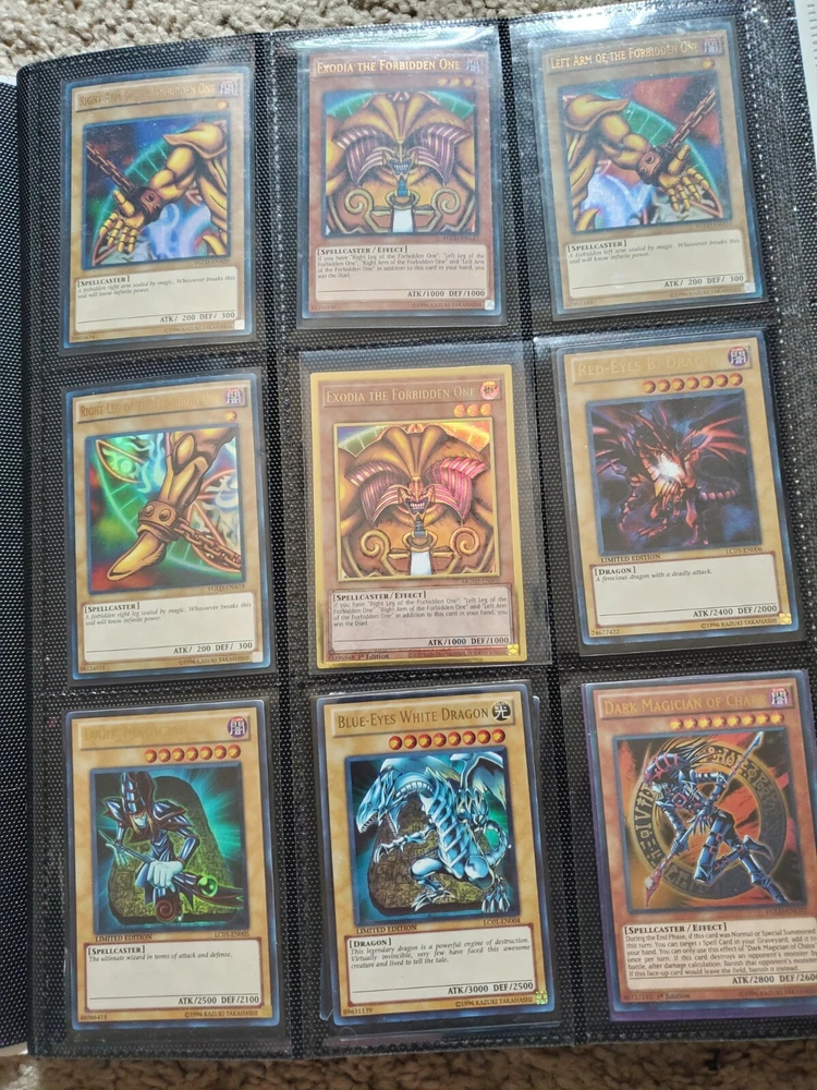 Yu-Gi-Oh binder collection, Includes vintage and some modern. Binder is included. Many Super Rares / Ultra Rares / Some Secret Rares 1st Editions / Unlimited / Limited Editions Some cards are Exodia, Blue-Eyes White Dragon, Dark Magician, Black Luster Soldier, Buster Blader, Flame Swordsman, Slifer the Sky Dragon, Winged Dragon of Ra, Obelisk the Tormentor, Conditions are mixed. Please bid in mind of mixed conditions. Sold as is