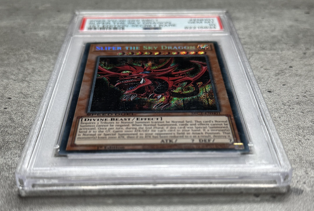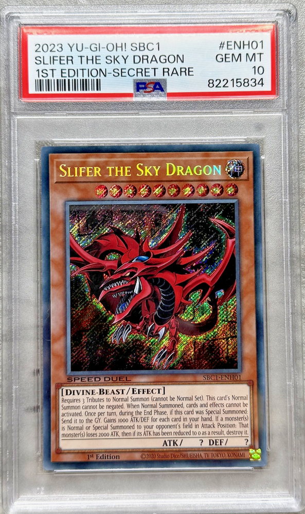 The card will come securely wrapped and packaged. A protective sleeve will come placed over the card’s case for added protection. This is a Yu-Gi-Oh! TCG card named "Slifer The Sky Dragon," featuring a Secret Rare rarity. It is a 1st Edition card with the serial number SBC1-ENH01, manufactured in the year 2023.