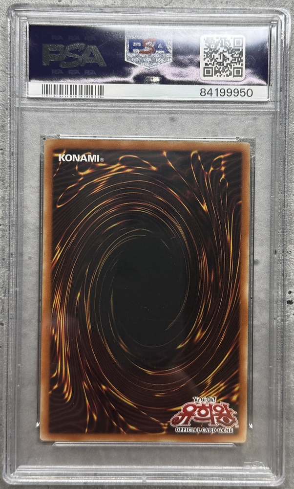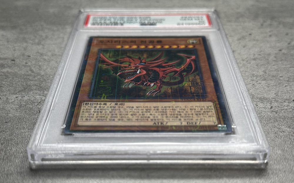 The card will come securely wrapped and packaged. A protective sleeve will come placed over card’s case for added protection. The product is a Korean version of the Yu-Gi-Oh! TCG card "Slifer The Sky Dragon," featuring a Millennium Rare rarity and a holographic finish. Manufactured by Konami in 2020, the card number is 15AX-KRY57. It has been professionally graded as PSA 10, indicating it is in perfect condition.