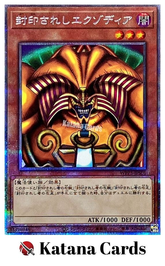 Yugioh Cards | Exodia the Forbidden One Prismatic Secret Rare | WPP3-JPS01 Japan C ondition Near Mint to Excellent Yugioh Cards Check our Yugioh cards here. D iscounts!!! Buy more than 2 cards in my store, Save 3 - 5% off for each cards. Yugioh Cards Check our Yugioh cards here. Discounts are applied automatically by simply adding the product to your cart! If the discount is not applied automatically due to eBay's system error, please inform us of the "Discount Error" in the message after purchasing the item. We will manually apply the discount based on the number of items purchased. S hipping We usually ship within 3 - 5 business days of receiving cleared payment. Economy Shipping - No Tracking Number - It takes 7 - 30 days after shipment. Expedited Shipping - Tracking Number - It takes 3 - 10 days after shipment. If you buy more than 2 cards and choose Expedited Shipping, please select Expedited Shipping for just 1 item. We will ship the items in one package. P ayment We can be contacted at any time through eBay messages if you have any questions, comments or product requests. We will respond to you within 24 hours and do our best to help you out! We encourage our customers to contact us with any questions or concerns! We'd like to be sure you are completely satisfied with your purchase. We do not mark merchandise values below value or mark items as gifts. US and International government regulations prohibit such behavior. I nternational Buyers - Please Note Import duties, taxes, and charges are not included in the item price or shipping cost. These charges are the buyers responsibility. Please check with your country's customs office to determine what these additional costs will be prior to bidding or buying.