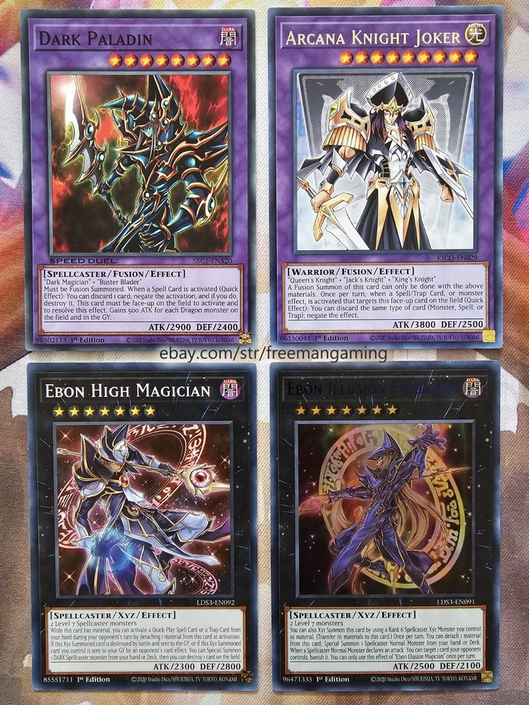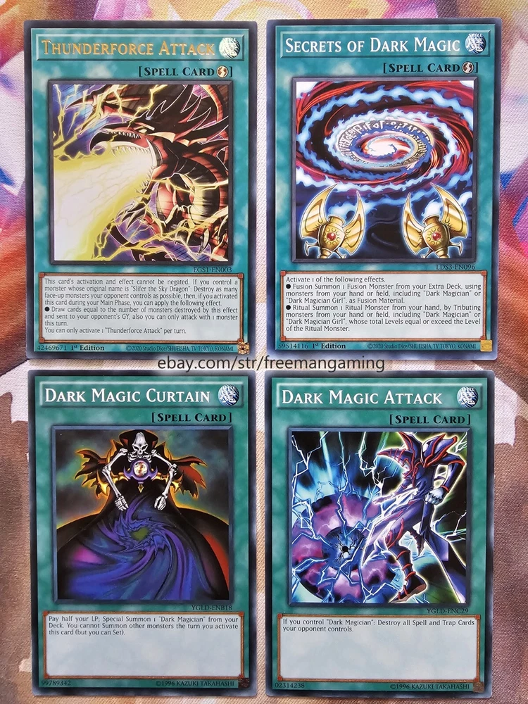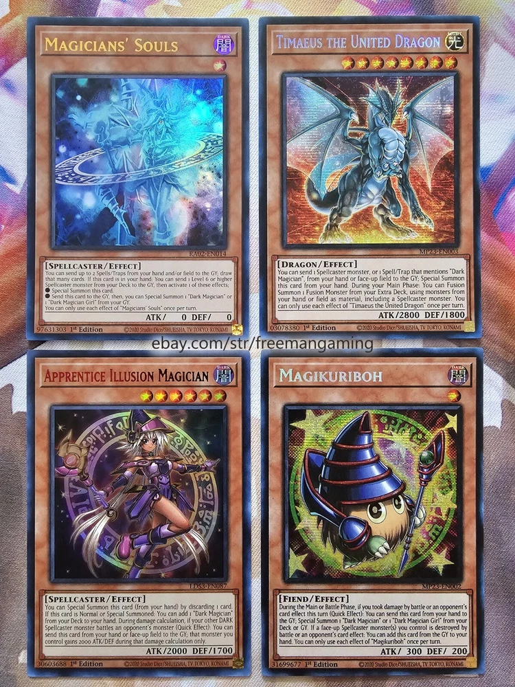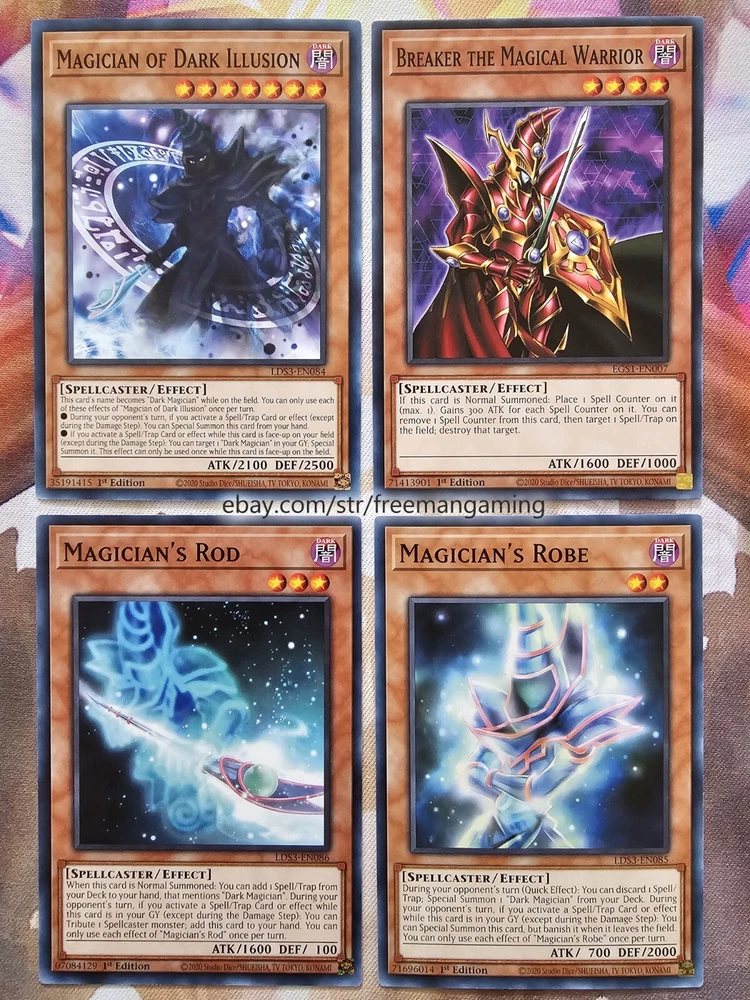 Item Description This 40 Card Dark Magician Deck (with 9 card extra deck) is fully built and ready to play! All cards are in NM Near Mint condition! Monsters - 19 1x Dark Magician (ultra rare) 1x Dark Magician Girl 1x Slifer the Sky Dragon (ultra rare) 1x Illusion of Chaos (ultra rare) 1x Magicians' Souls (ultra rare) 1x Timaeus The United Dragon (secret rare) 1x Apprentice Illusion Magician (colored ultra rare) 1x Magikuriboh (ultra rare) 1x Magician of Dark Illusion 1x Magician's Rod 1x Magician's Robe 1x Breaker the Magical Warrior 1x Skilled Dark Magician 1x Dimension Conjurer 1x Buster Blader 1x Kuriboh 1x King's Knight 1x Queen's Knight 1x Jack's Knight Spells - 14 1x Polymerization (super rare) 1x The Eye of Timaeus (colored ultra rare) 1x Dark Magical Circle (colored ultra rare) 1x Magician's Salvation (ultra rare) 1x Dark Burning Attack (secret rare) 1x Thunderforce Attack (ultra rare) 1x Dark Magic Attack 1x Secrets of Dark Magic 1x Dark Magic Curtain 1x Thousand Knives 1x Magical Dimension 1x Brain Control 1x Monster Reborn 1x Swords of Revealing Light Traps - 7 1x The Revived Sky God (ultra rare) 1x Eternal Soul (ultra rare) 1x Magician's Combination (colored ultra rare) 1x Magician Navigation 1x Magical Hats 1x Magic Cylinder (super rare) 1x Mirror Force (super rare) Extra Deck - 9 1x Master of Chaos (secret rare) 1x Red-Eyes Dark Dragoon (ultra rare) 1x Dark Magician the Dragon Knight (ultra rare) 1x Dark Magician Girl the Dragon Knight (colored ultra rare) 1x Amulet Dragon 1x Dark Paladin 1x Arcana Knight Joker 1x Ebon High Magician 1x Ebon Illusion Magician (colored ultra rare) All items are in mint/near mint condition unless otherwise specified in the title or description. This listing is for the items named in the title and pictured here. What you see in the picture is what you will receive.