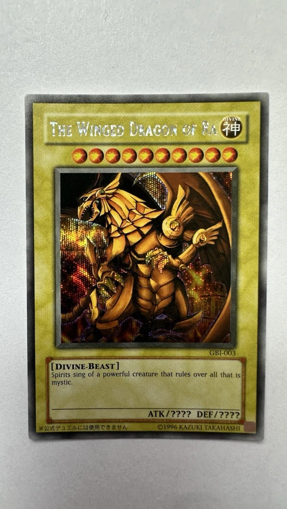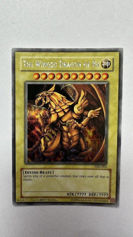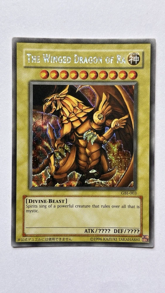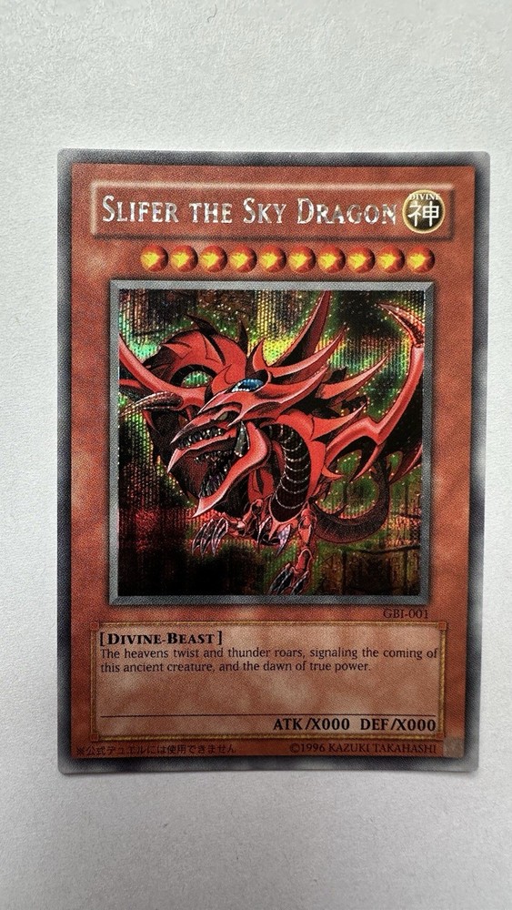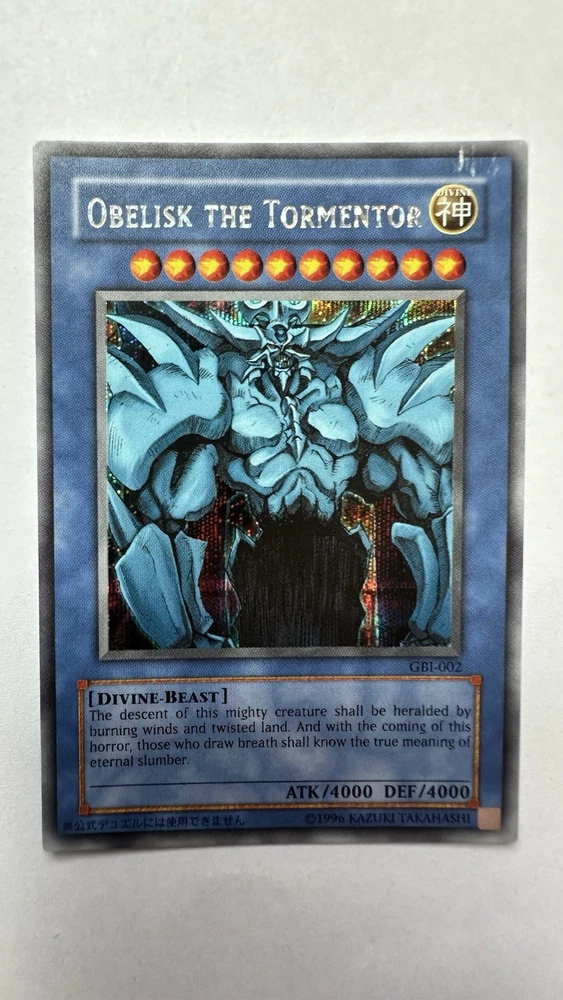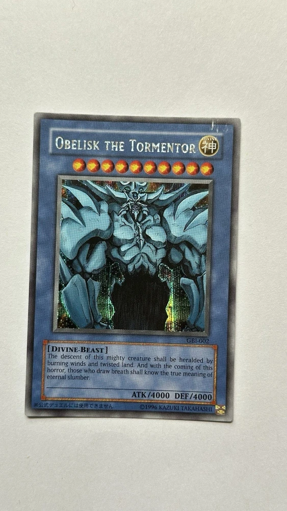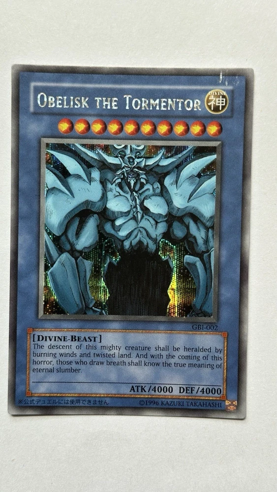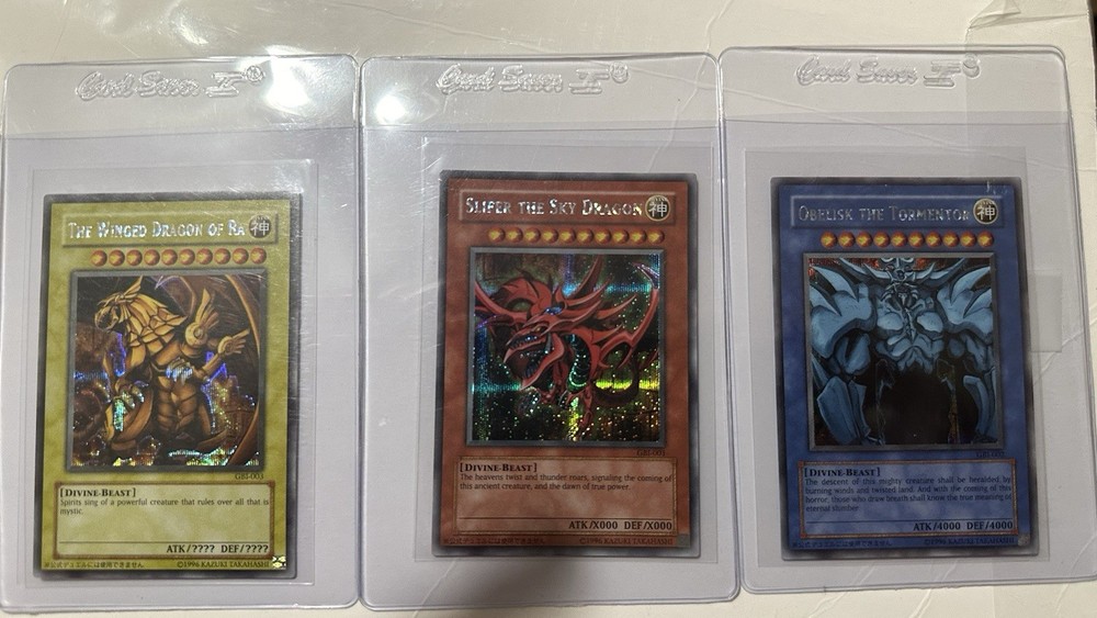 Yu-Gi-Oh Egyptian God Cards - Slifer the Sky Dragon, Winged Dragon of Ra, and Obelisk the Tormentor GBI-001, GBI-002, and GBI-003. Each card is in amazing condition (see pictures for details) Obelisk the tormentor does have some slight wear on the front of the card but overall the rest of it is in great condition and the other two are in almost immaculate condition Lightning fast shipping low price!