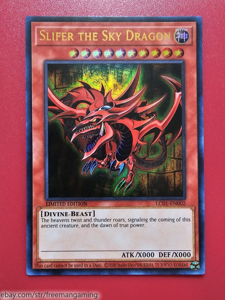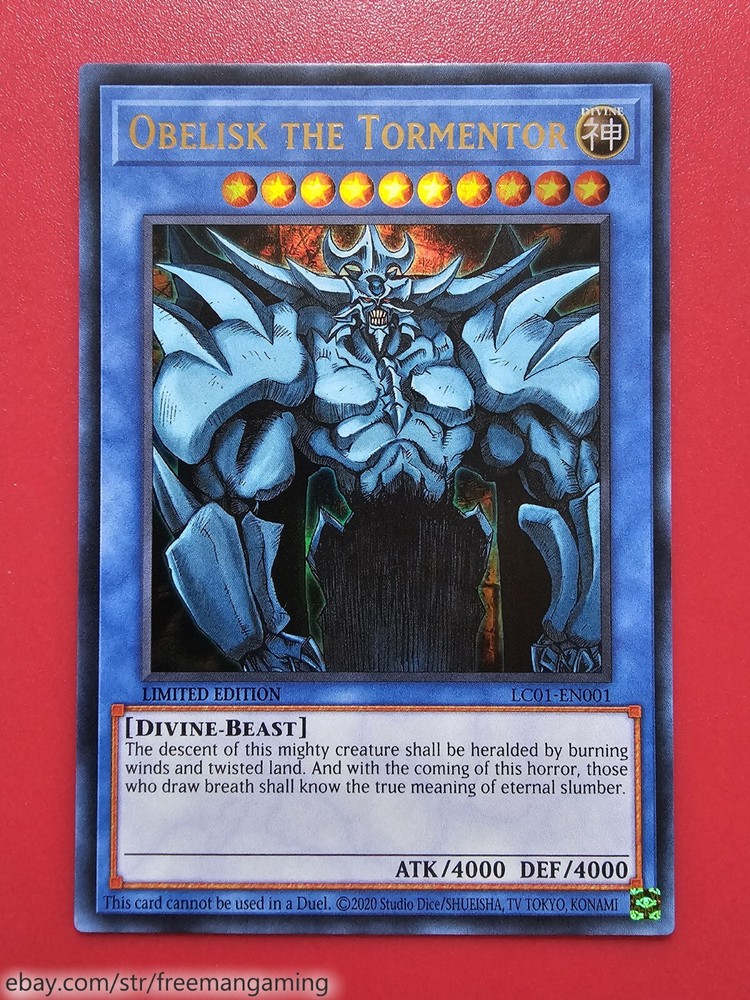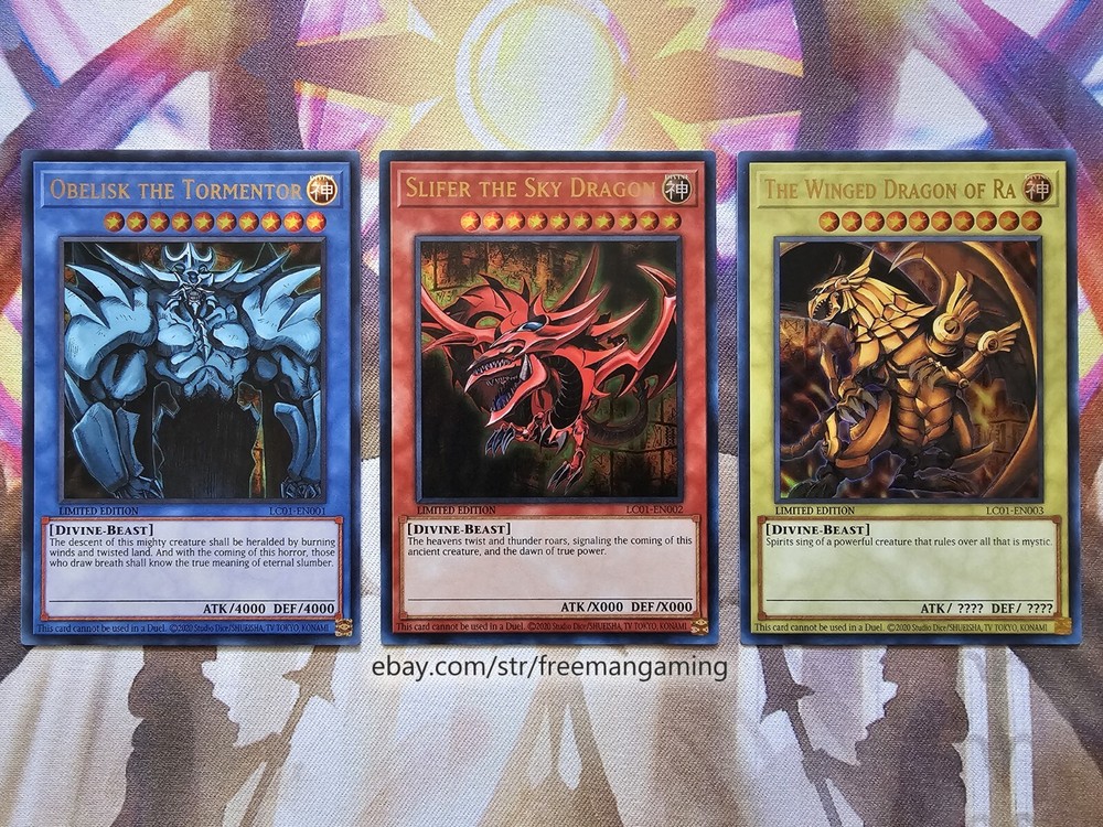 Item Description 1x Obelisk the Tormentor 1x Slifer the Sky Dragon 1x The Winged Dragon of Ra All cards are in NM Near Mint Condition All items are in mint/near mint condition unless otherwise specified in the title or description. This listing is for the items named in the title and pictured here. What you see in the picture is what you will receive.
