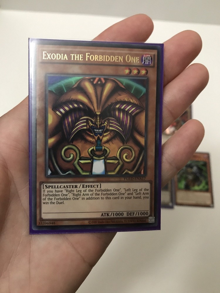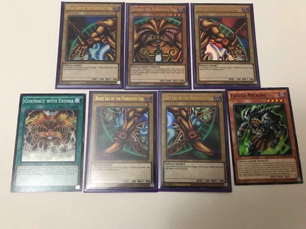 This is a full set of Yugioh! Exodia The Forbidden One cards, including all five cards. The cards are in excellent shape and have been well-maintained, ready for you to add to your collection. These cards are ultra-rare and highly sought after, making them a valuable addition to any Yu-Gi-Oh! TCG collection. The set includes cards from the character family of Yu-Gi-Oh!, manufactured by Konami. These cards are perfect for collectors or players looking to complete their set.
