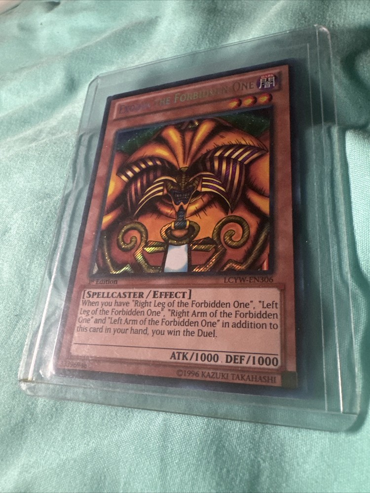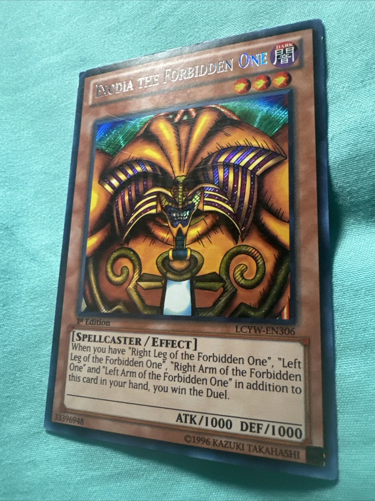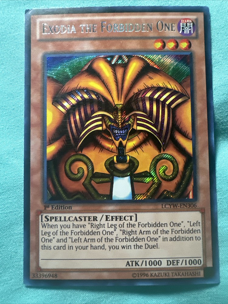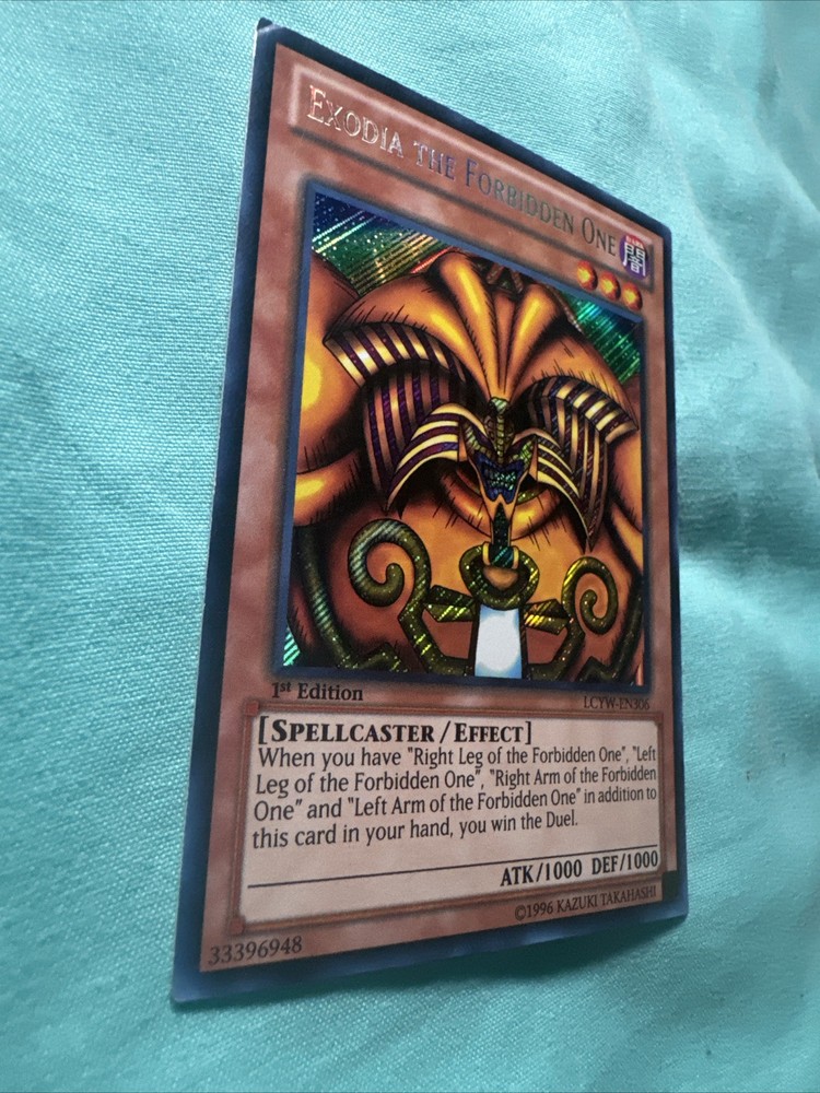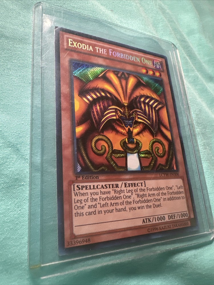 The product is a Yu-Gi-Oh! TCG card named "Exodia the Forbidden One" with a Secret Rare rarity. It is in English and features the 1st Edition mark. The card is a Japanese-sized version. Known for its iconic appearance and powerful abilities in the game, this collectible card is sought after by players and collectors alike for its significance and rarity.