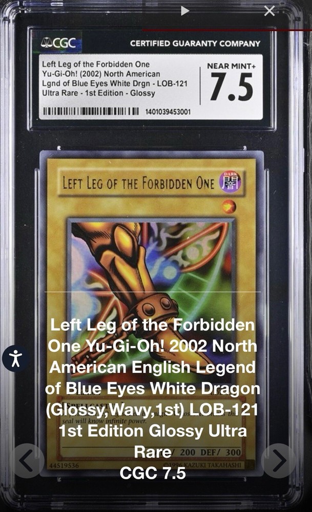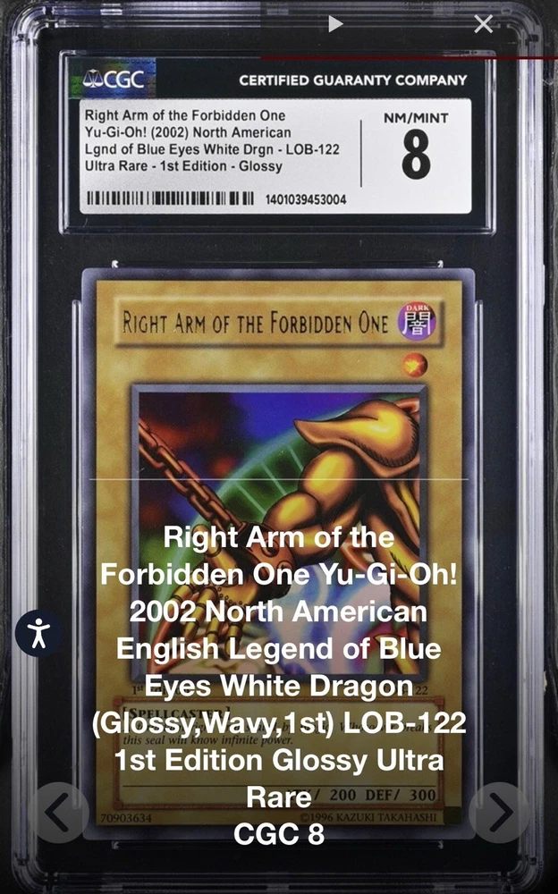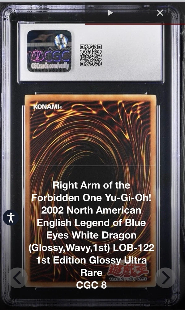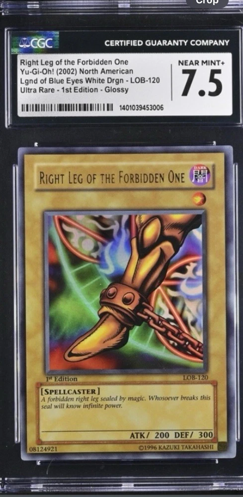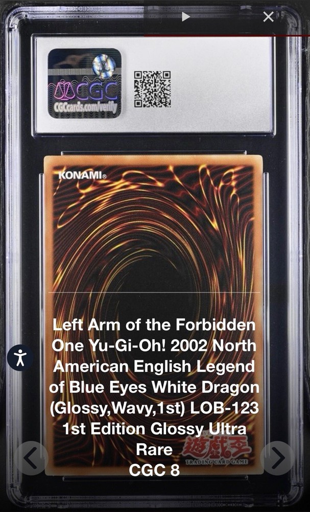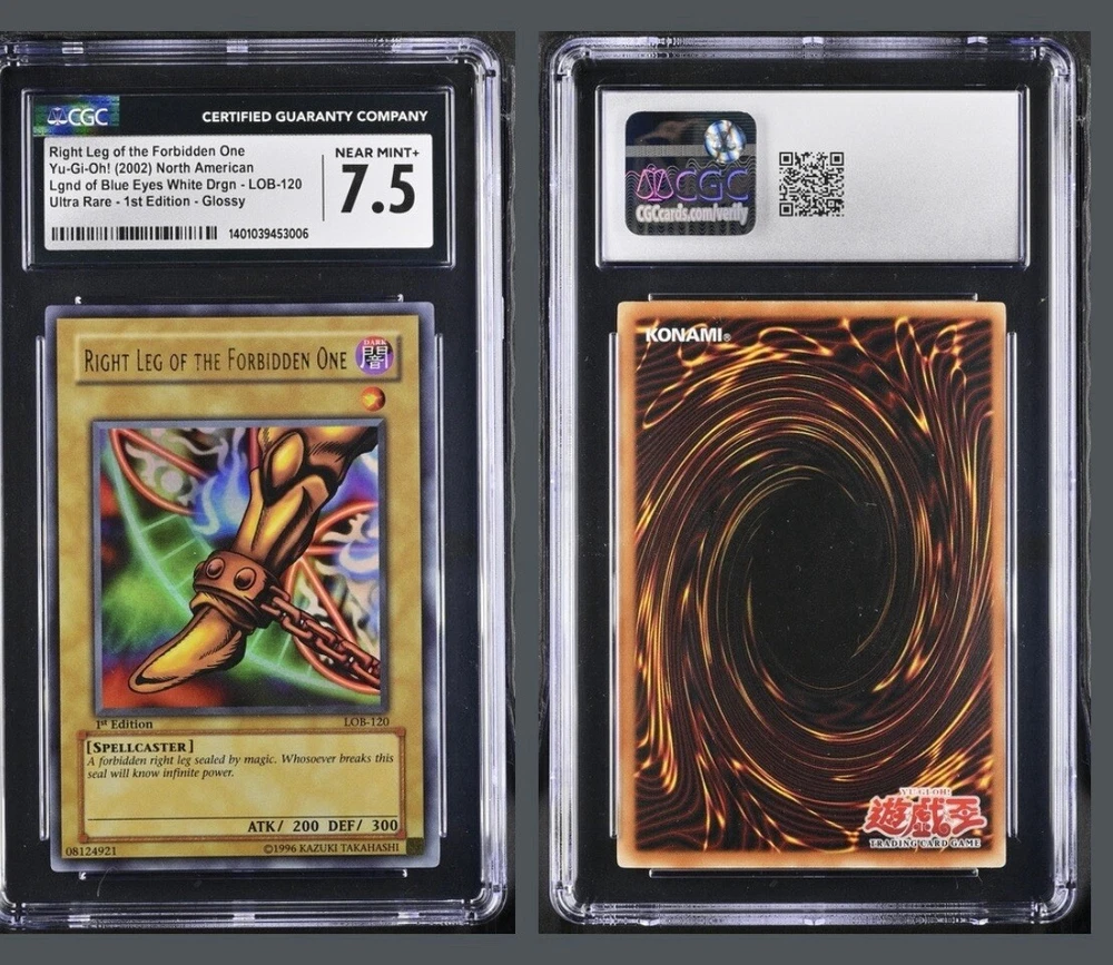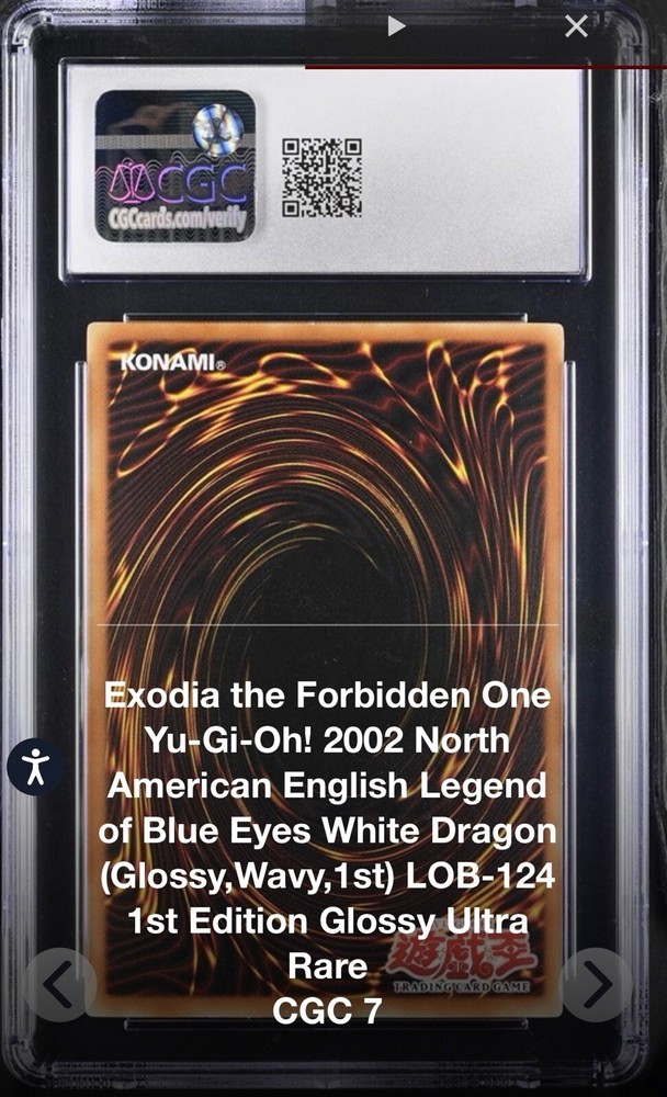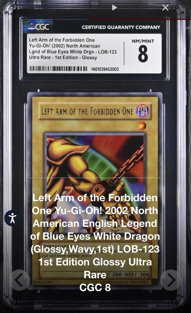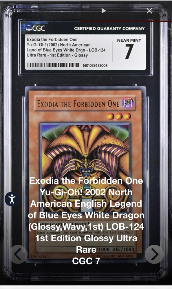 Note this auction is for all 5 ultra rare cards shown. This Exodia Set with a copyright date of 1996 is quite rare as these cards are all near mint condition. This is a highly sought-after Yugioh card, Exodia the Forbidden One, from the Legend of Blue Eyes White Dragon set. And we are including the right Arm and Leg and Left Arm and Leg. (5 cards total). It features the characters Yami Yugi, Seto Kaiba, and Yugi Muto, and is a limited edition 1st edition card with a glossy wavy finish. The card is in ultra rare status and was manufactured by Konami in the United States in 1996. It is an effect card and is available in English language for ages 4 and up. The card size is standard and it is a perfect addition to any Yugioh collector's set. Note we are selling not only this card LOB-124 White Dragon but the entire set that makes up Exodia: Left Arm Right Arm Left Leg and Right Leg. 5 cards total. All cards are slabbed and graded. (LOB-120 to 124) We do not want split the set. All cards are graded by CGC professionally. See the pictures for the grades and further details of the cards. The grader certified these as 2002 BUT the Copyright on the cards is 1996. The grader certified these as North American English but these are English and as we understand were produced in the USA. These were purchased on the military bases in Korea and Hawaii from 1996 to 2006 and had been in Storage for 20 to 25 years. Nonsmoking pet free home and stored under lock and key. Now all 5 ultra rare cards are slabbed and graded by CGC. Buy it now OR make an offer.