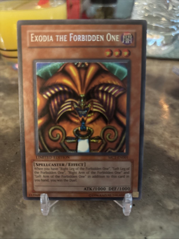 The product is a Yu-Gi-Oh! collectible card game item, specifically the Exodia The Forbidden One card from the Master Collection Volume 1 set. This limited edition card features a dark attribute, high defense and attack stats, a holo finish, and is considered a secret rare within the Yu-Gi-Oh! TCG. Manufactured by Konami in the United States, this English-language card is a valuable addition to any collector's deck. The card portrayed Yugi Muto's character and falls under the Spellcaster monster type, making it a sought-after item for fans of the game.