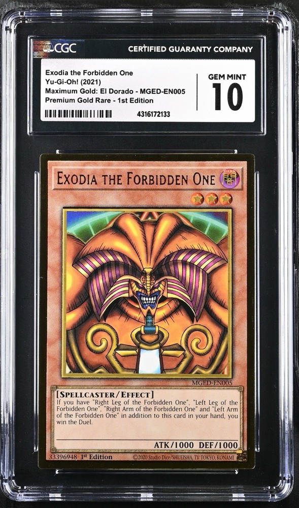 The product is a Yu-Gi-Oh! Exodia The Forbidden One card from the MGED El Dorado Gold set, signed by Dan Green and authenticated by Professional Sports Authenticator (PSA). This Japanese-sized card features a Monster attribute, Holo finish, and is considered a Super Holo Rare. Illustrated by Kazuki Takahashi, the card is highly sought after by collectors of Yu-Gi-Oh! TCG cards and features a speciality of being signed by the Yugi voice actor Dan Green, making it a unique and valuable addition to any collection. Exclusive Simply Unlucky logo on back of slab. No returns, refunds, or cancellations. All sales are final. Thank you!