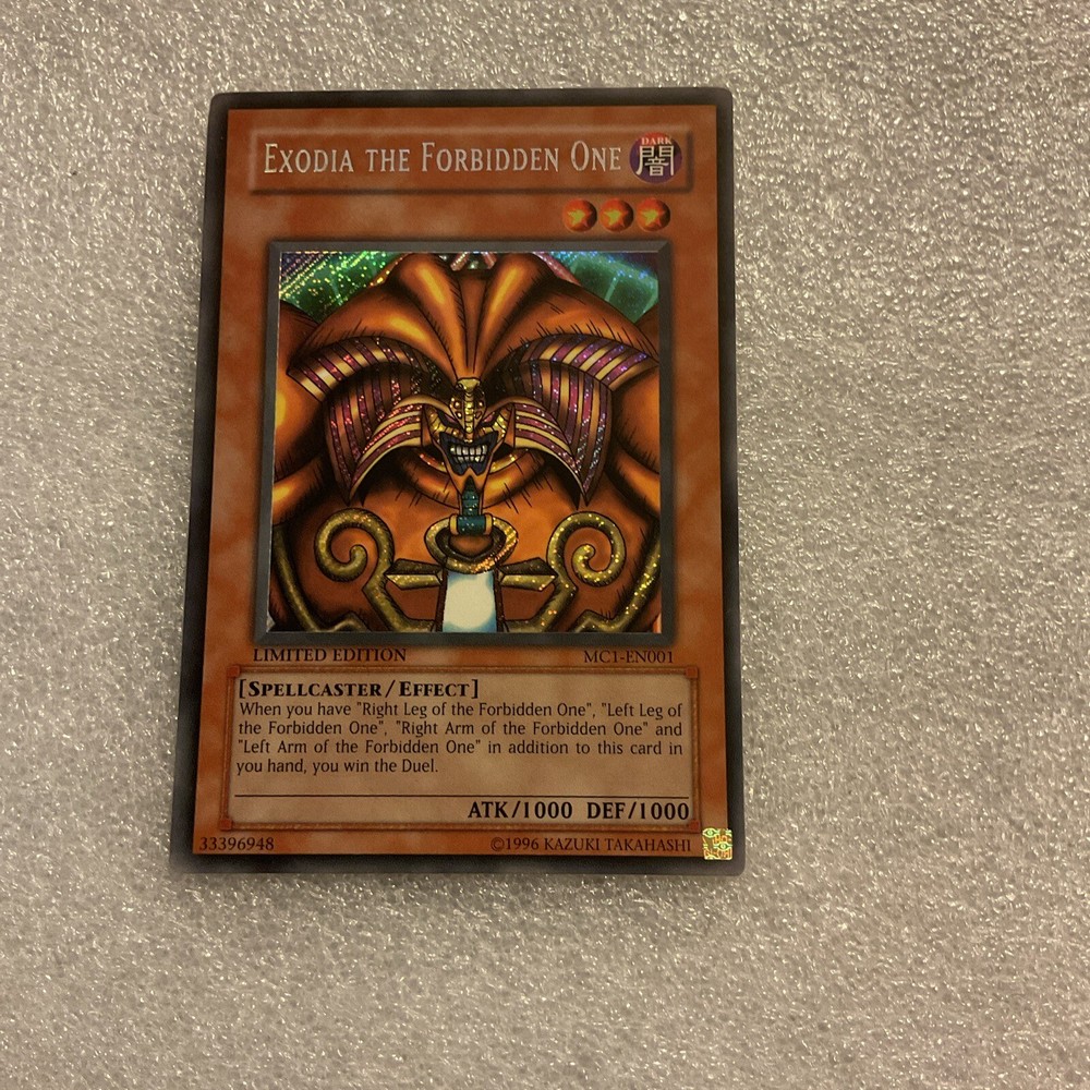 This limited edition Yu-Gi-Oh! TCG card features the infamous Exodia the Forbidden One, known for its rarity and power. With a Secret Rare rarity, this card is highly sought after by collectors and players alike. The card is in near mint or better condition, making it a valuable addition to any collection. The MC1-EN001 card name and attributes are clearly stated in the title and aspects sections, providing all necessary information for potential buyers. This card falls under the Toys & Hobbies and Collectible Card Games categories, specifically CCG Individual Cards. Don't miss out on the chance to add this highly coveted card to your collection.