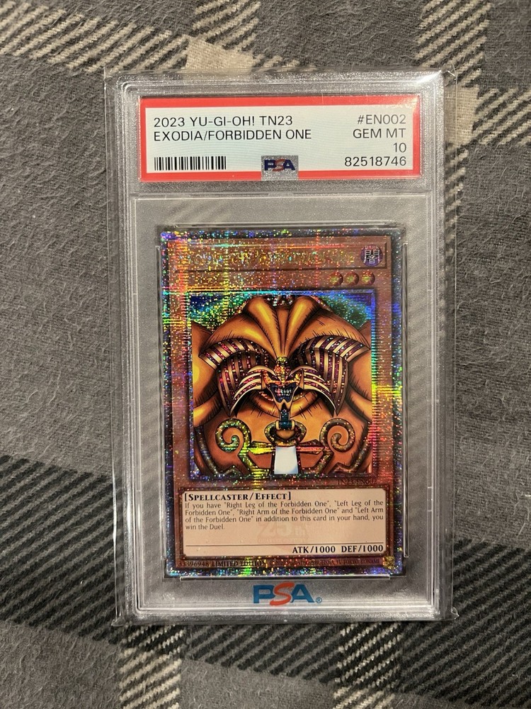 Unleash the power of Exodia the Forbidden One with this stunning Quarter Century Secret Rare card from the 25th Anniversary Tin: Dueling Heroes set. The card, numbered TN23-EN002, boasts a pristine foil finish that captures the dark essence of this iconic effect type card. Manufactured by Konami in 2023, this limited edition promo piece is a must-have for collectors and players alike, offering a touch of rarity and prestige to your Yu-Gi-Oh! TCG arsenal. Graded a perfect 10 by the Professional Sports Authenticator (PSA), this card is crafted from high-quality card stock and presented in Japanese card size. Its attributes include the distinct 'Dark' color, ensuring Exodia's ominous presence is felt in your deck or display. Dive into the rich legacy of the Yu-Gi-Oh! universe with this exceptional piece, a true gem for enthusiasts and historians of the game.