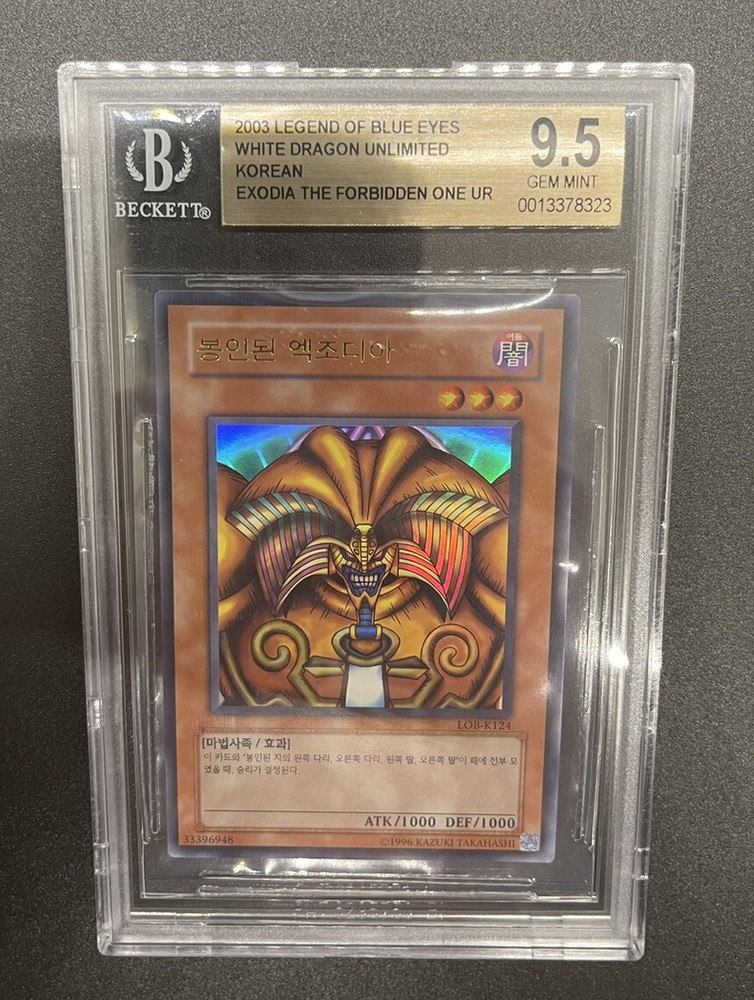 Yugioh - Exodia the Forbidden One - LOB-K124 - Ultra Rare Korean - Beckett 9.5. All Graded Cards will be shipped well protected in a bubble mailer with tracking provided once shipped. All orders will be shipped same day, or next day at the very latest. Any questions feel free to ask. If You Are Planning On Purchasing Multiple Items Message Me To Combine Shipping. I Also Offer Discounts For Purchases Of Multiple Items. Thank you!