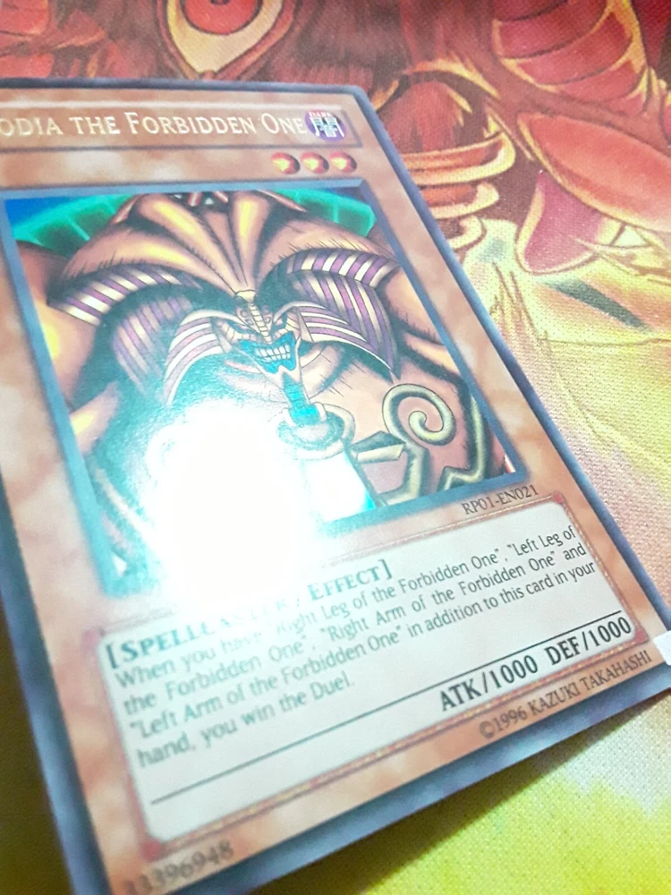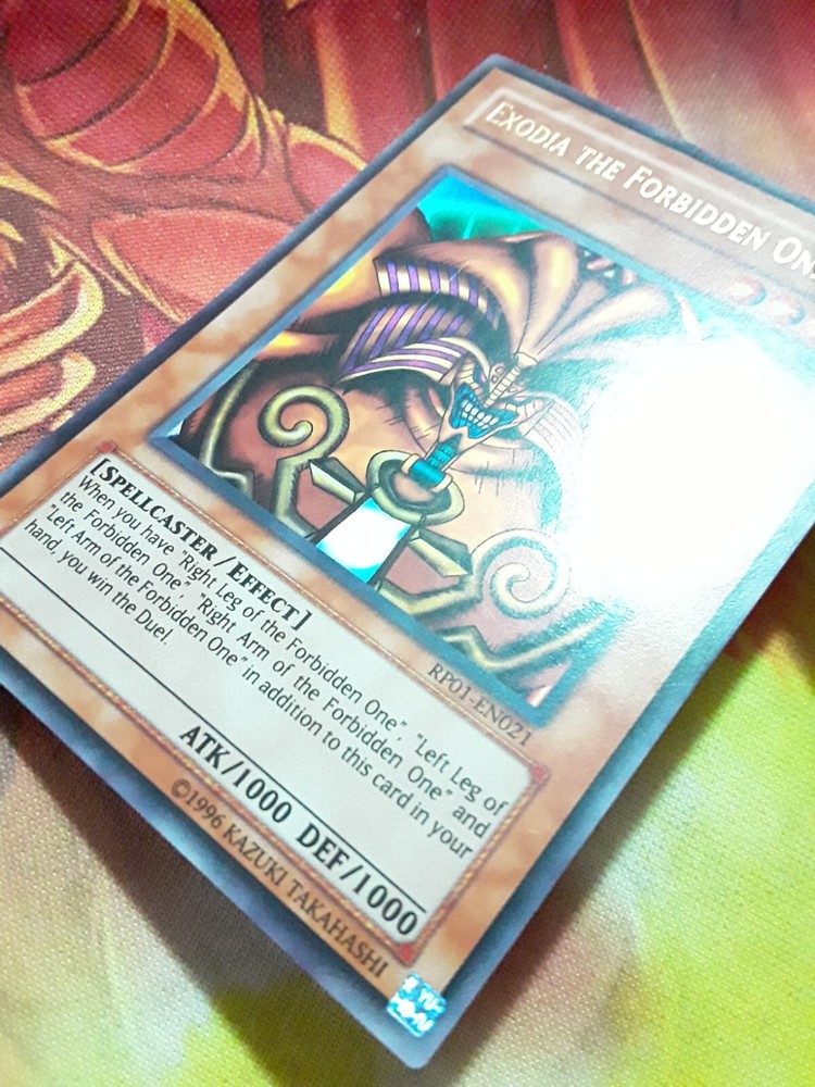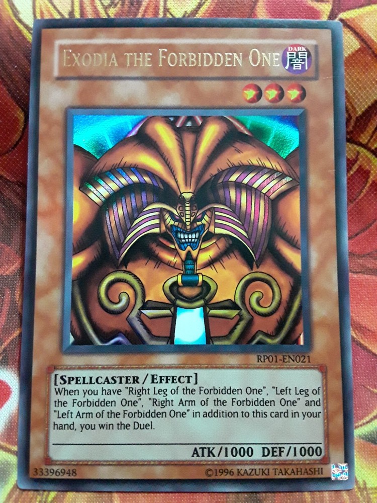Exodia the Forbidden One from RP01 Ultra Rare This card is in a lightly played condition. The card is sent in a card sleeve and a hard plastic top loader. If a large number of cards are purchased at once, the cards may be sent in a safe and secure container instead. If payment is not made within 72 hours of selecting a card(s), the item will no longer be entitled to you, unless you contact us asking for more time. We do not cancel orders because a card has changed in price. Shipping: Orders are shipped within two business days of a purchase being completed. Sorry, we do not provide tracking for orders under $20 Once an item is marked as shipped, the order has been dropped off at the post office. Please note that from there we cannot control how quickly the postal service operates. We do our best at being 100% honest and fair with the cards' conditions, any questions you may have, and the prices of the cards, so please be honest buyers. If you have any questions or concerns, please let us know, and we will be glad to assist. Check out the other cards we have listed! Thank you in advance, and happy dueling!