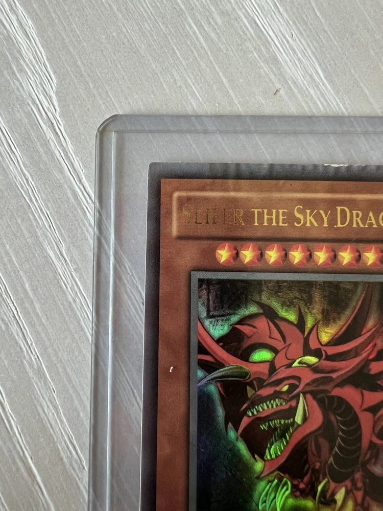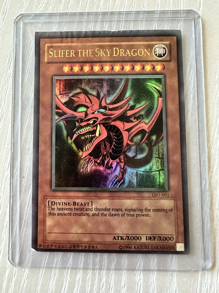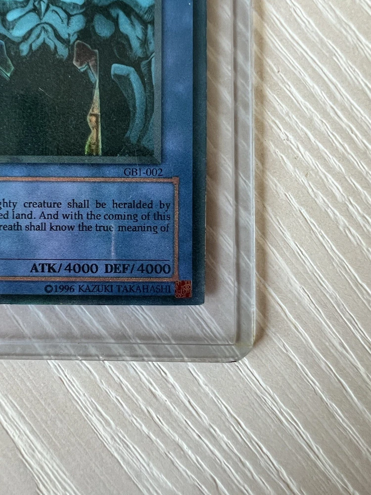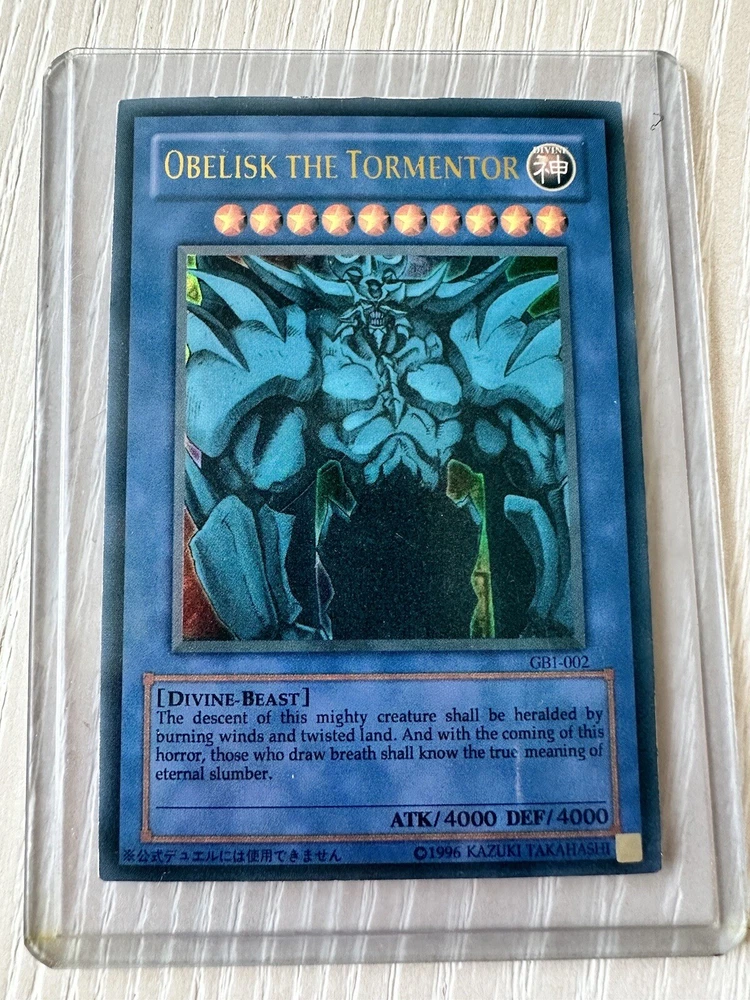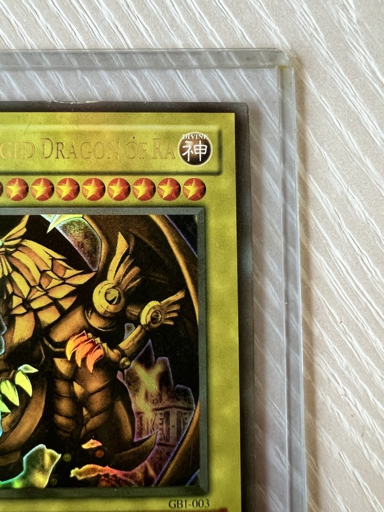 Add the three Egyptian God Cards to your Yu-Gi-Oh! collection from mine. I have had these since I was a kid and have recently pulled them out of the closet. These belong with someone who appreciates and values them more than I do so please, buy them from me! I provided detailed pictures so that you may see the wrinkling of Slifer The Sky Dragon and other small defects. These are ungraded Slifer The Sky Dragon GB1-001, Obelisk The Tormentor GB1-002, The Winged Dragon of Ra GB1-003.
