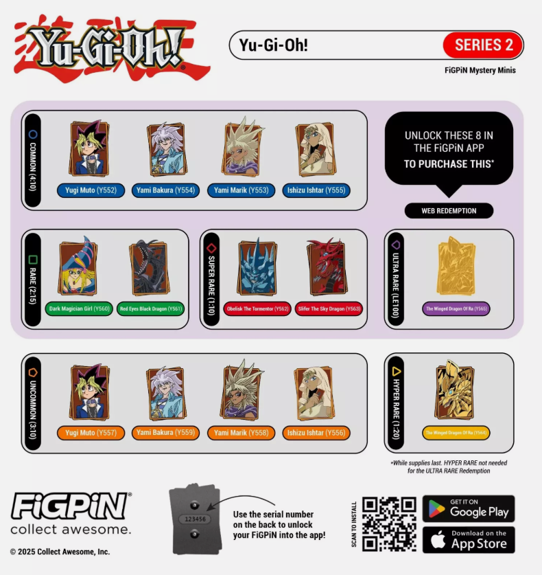 These are officially licensed Yugioh/Konami pins made by FigPin. Other than photo purposes, these pins have never been used for anything and have never been removed from their pin holders. They are all "Locked" (The Serial Number on the back has NOT been redeemed in the app). These pins come from the Yugioh Mystery Series 2. The pull rates for each pin are pictured. This listing allows you to choose exactly which pin(s) you'd like to buy. It has flat rate shipping, meaning no matter how many pins (or boxes) you purchase, the shipping cost stays at $4.99 (Buy 1 pin, pay $4.99 shipping. Buy 10 pins, still just pay a total of $4.99 for shipping). For example, if you purchase 10 pins for $100 then you will pay $104.99 for your order.
