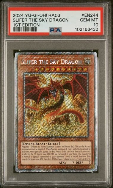 The product is a Yu-Gi-Oh! TCG card from the set "The Dark Side of Dimensions Movie Pack Secret Edition." It features "Slifer The Sky Dragon" as the card name and belongs to the Divine attribute with a Rarity of Platinum Secret Rare. Manufactured by Konami in 2020, this English language card falls under the Card Type category of Effect. Being a highly sought-after collectible card, it has been graded as a PSA 10, indicating its top-tier condition and desirability among collectors and players alike.