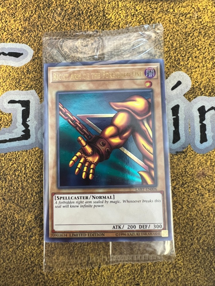 You are bidding on a Yugioh SEALED Right Arm of the Forbidden One LART-EN006 Ultra Rare Limited Edition Promo!! PLEASE NOTE: This item is still sealed in it's package! Due to the fact that we have multiple quantity of the item listed, the photos above are indicative of the item you'll receive but may not be of the actual item you receive. Shipping is FREE on this item in the United States! All purchases above $15 will be shipped First Class, Parcel in a padded envelope. All cards will be shipped in sleeves and top loaders. Please allow 2-3 business days handling time. Make sure to check out our other listings for all of your favorite Trading Card Games! Thanks for shopping at Yeti Gaming!