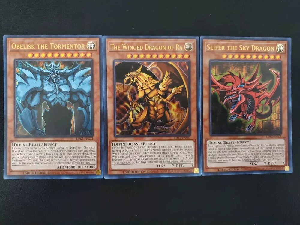 Hello!!! I am a Male Yugioh & Magic Collector & New Ebay Seller!!! I aim for 100% Customer Satisfaction so please!!! Message me about an item if you are not completely Satisfied with it. Below is the featured item if you have any questions please Message me!!! Happy Bidding!!! Picture may have been edited due to Inventory Changes Please read description Below Please Allow me the Set Handling time before your item will be shipped! It may take the full handling time set Thank You!!! Below is the featured item if you have any questions please MSG me!!! Happy Bidding!!! As a Bonus for buying my auction you will Recieve a Free Holo Card from my vast collection. It can be Super Rare, Ultra Rare, or Secret Rare or even GHOST Rare!!! You are bidding on: 3 - Card Set (Buyer receives all 3 cards!) 1x The Winged Dragon Of Ra 1x Slifer The Sky Dragon 1x Obelisk The Tormentor