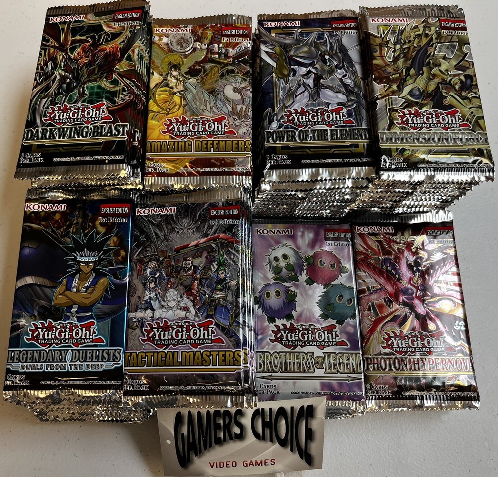 New, Sealed, Removed from shelves for space. Retail over $900 Answers 1. Yes, all packs are from same box 2. Sorry, boxes were not kept 3. No hits were seen in my shop 4. Yes, some boxes were full Yu-Gi-Oh! +++ Lot 159 - Sealed Yu-Gi-Oh! Booster Packs *10- Photon Hypernova *13- Brothers of Legend *21- Tactical Masters *25- Legendary Duelists *23- Dimension Force *21- Power of the Elements *23- Amazing Defenders *23- Darkwing Blast 17- Structure Decks *12- Legend of the Crystal Beasts *3- Albaz Strike *1- Egyptian God Deck “Slifer the Sky Dragon” *1- Egyptian God Deck “Obelisk the Tormentor” 8- 60ct Dragon Shield Japanese Size Card Sleeves *2- Matte White *2- Matte Black *2- Matte Sky Blue *1- Matte Petrol *1- Matte Night Blue 3- Speed Dual GX “Midterm Paradox” If you have any questions please feel free to contact me. Thank you for looking