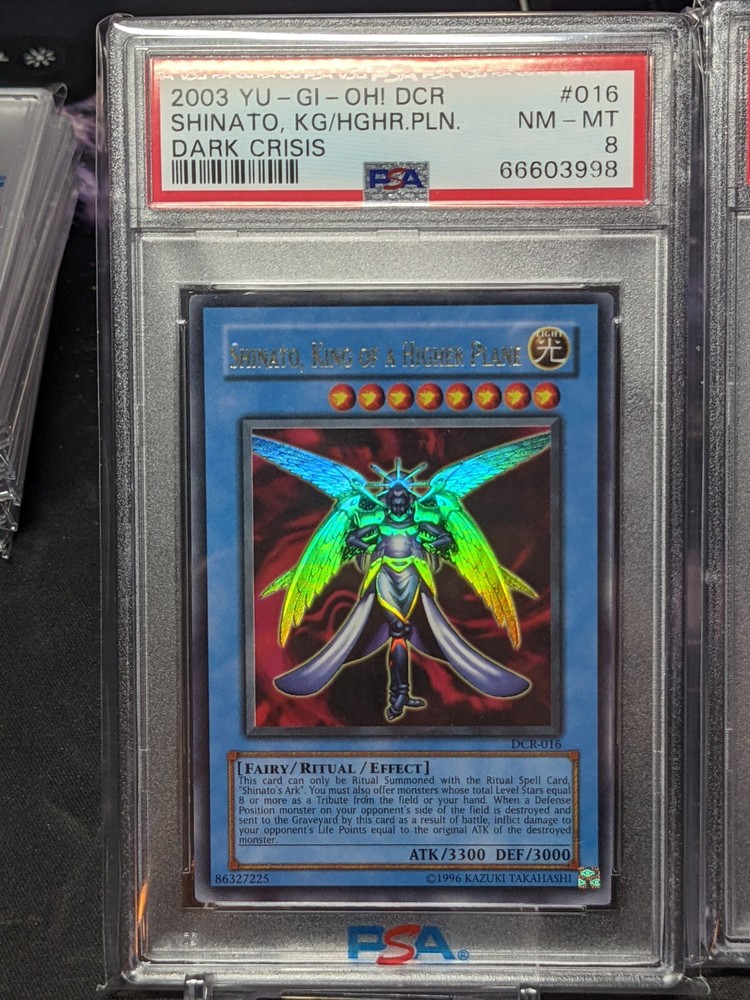 YUGIOh Shinato, King of a Higher Plane PSA 8 DCR-016 NM-MINT Ultra Rare Holo Hello all! Shinato, King of a Higher Plane freshly graded from PSA 8. Original owner and not a reprint. I tem ships in PSA wrapper. As a collector, I understand the importance of shipping. Items will be very well protected and shipped with extreme care. Please message me with any questions or concerns. Also, please check out my other auctions of comics books, Yugioh cards. and Pokemon cards. Thank you! Priority Shipping