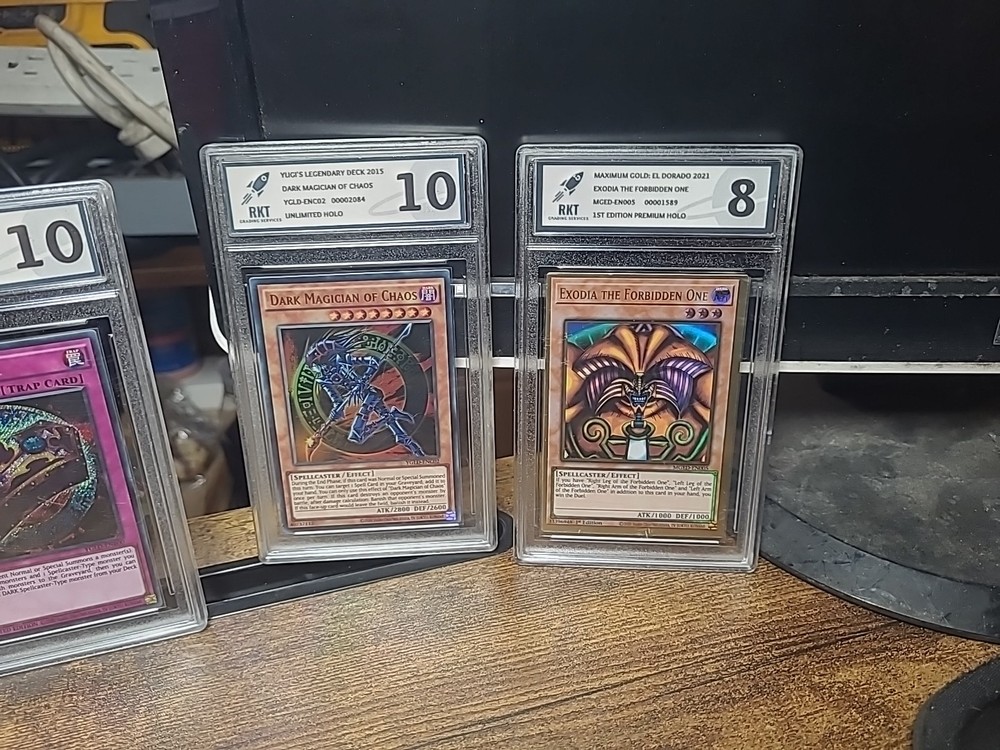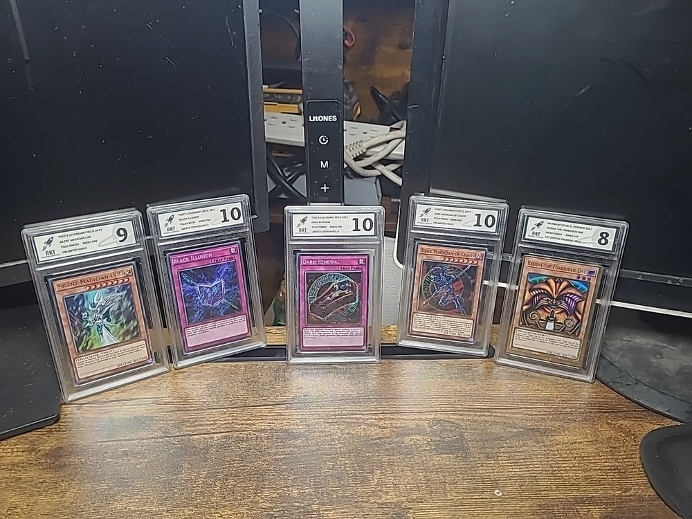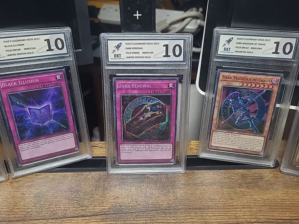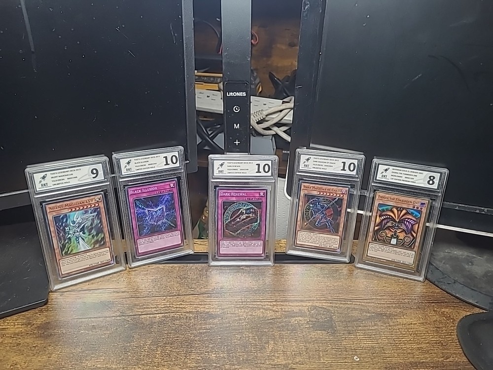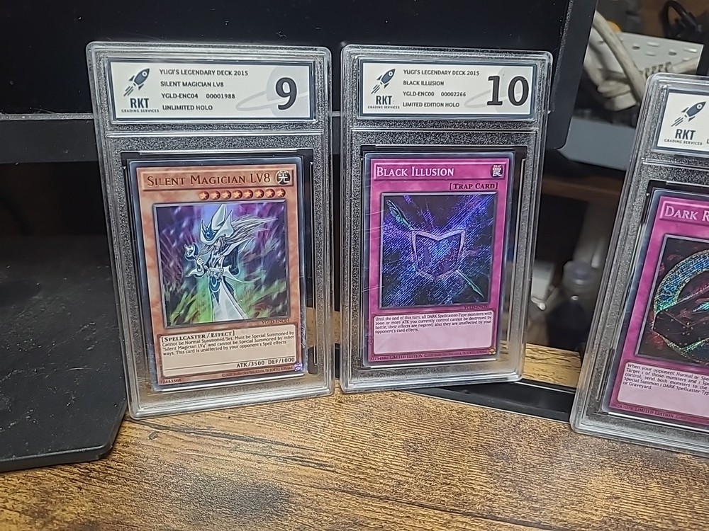 This is a lot of 5 graded holographic Yu-Gi-Oh! TCG cards from RKT Grading. The lot includes cards featuring popular characters such as Dark Renewal, Exodia, Dark Magician of Chaos, Black Illusion, and Silent Magician LV8. These cards are all 1st Edition and made of high-quality card stock material. The cards are in excellent condition and have a beautiful foil finish. This is a great deal for any Yu-Gi-Oh! TCG collector or player. The cards are in English and suitable for ages 6 and up. Made in the United States, this lot is perfect for anyone looking to add some vintage cards to their collection.