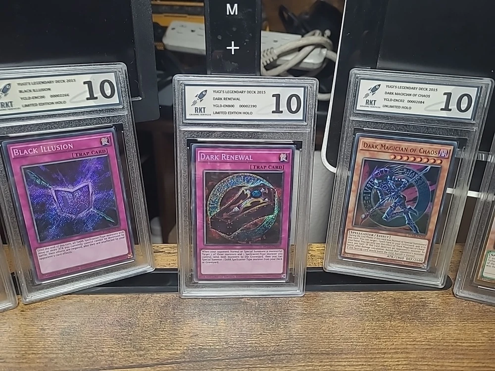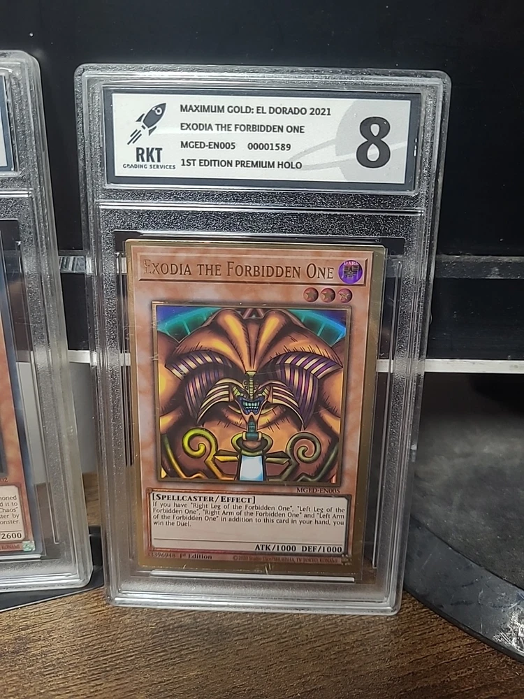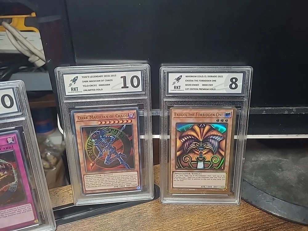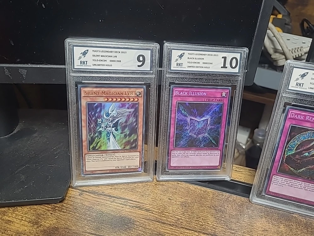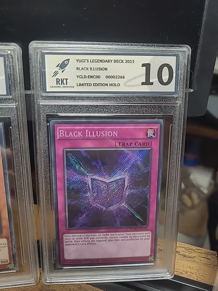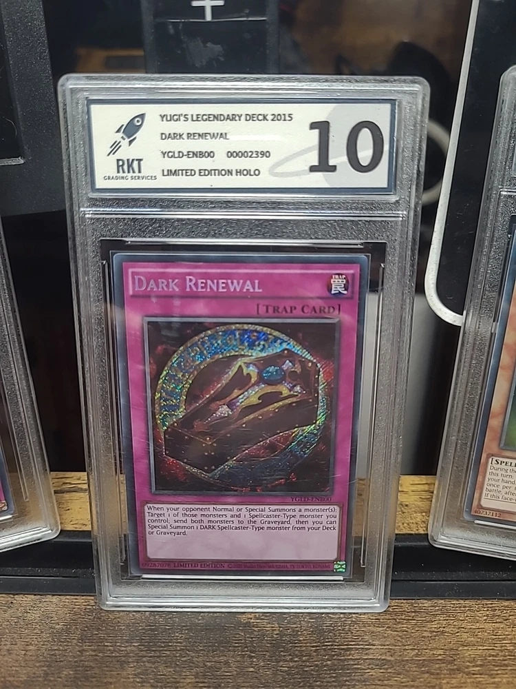 This is a lot of 5 graded holographic Yu-Gi-Oh! TCG cards from RKT Grading. The lot includes cards featuring popular characters such as Dark Renewal, Exodia, Dark Magician of Chaos, Black Illusion, and Silent Magician LV8. These cards are all 1st Edition and made of high-quality card stock material. The cards are in excellent condition and have a beautiful foil finish. This is a great deal for any Yu-Gi-Oh! TCG collector or player. The cards are in English and suitable for ages 6 and up. Made in the United States, this lot is perfect for anyone looking to add some vintage cards to their collection.