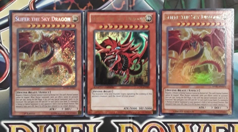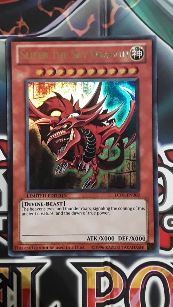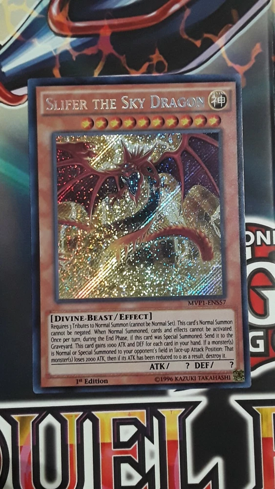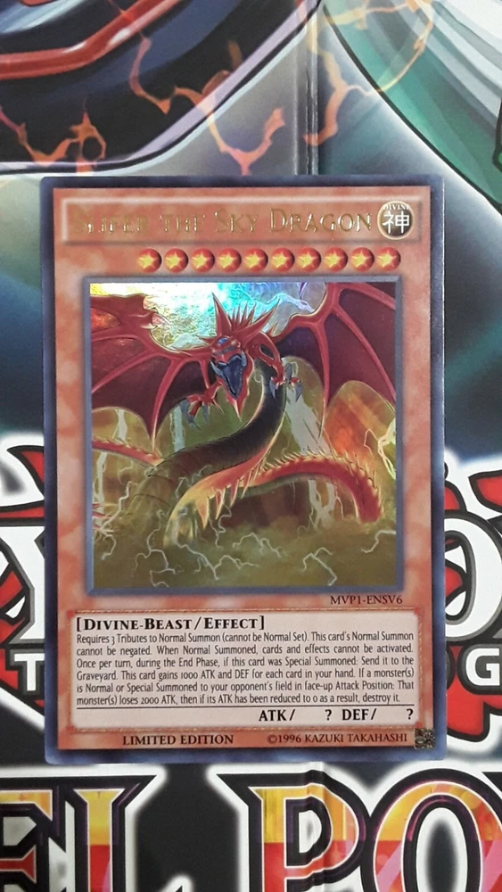 This lot includes three limited edition Yugi Slifer The Sky Dragon cards, featuring a holographic finish and English language. The cards are from the Yu-Gi-Oh! TCG game, with card sizes of standard. They are MVP1-ENS57, MVP1-ENSV6, and LC01-EN001, and are manufactured by Konami. These cards are perfect for collectors and players alike, and are sure to be a valuable addition to any collection.