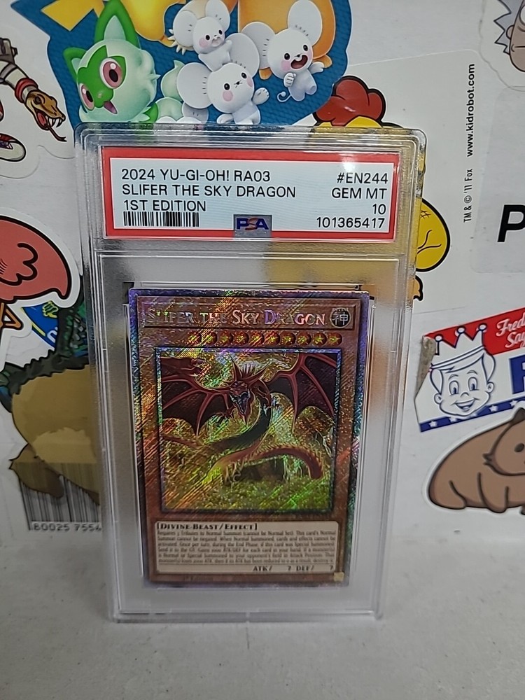 *In hand ready to ship *please see photos The product is a Yu-Gi-Oh! card featuring "Slifer The Sky Dragon" from the "Quarter Century Bonanza" set in a Platinum Secret Rare rarity. It is graded as a PSA 10, indicating it is in pristine condition. The card is a Spellcaster type creature/monster and has a Darkness attribute. It is manufactured by Konami and has a Holo finish, making it a highly coveted and valuable collectible card for fans of the Yu-Gi-Oh! trading card game.