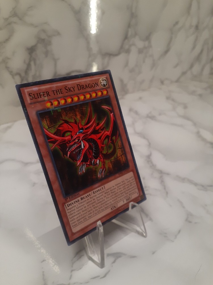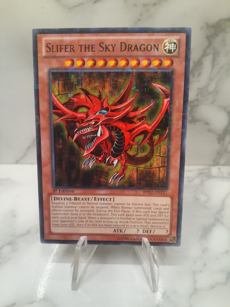 This Yu-Gi-Oh! card is a must-have for any collector. The Mosaic Rare Slifer The Sky Dragon from the Battle Pack 2: War of the Giants set is a highly coveted item. This card, BP02-EN127, is a 1st Edition that is in very lightly played to near mint condition, making it a great addition to any collection. Its rarity and features, including its unique design and abilities, make it a valuable and sought-after card.