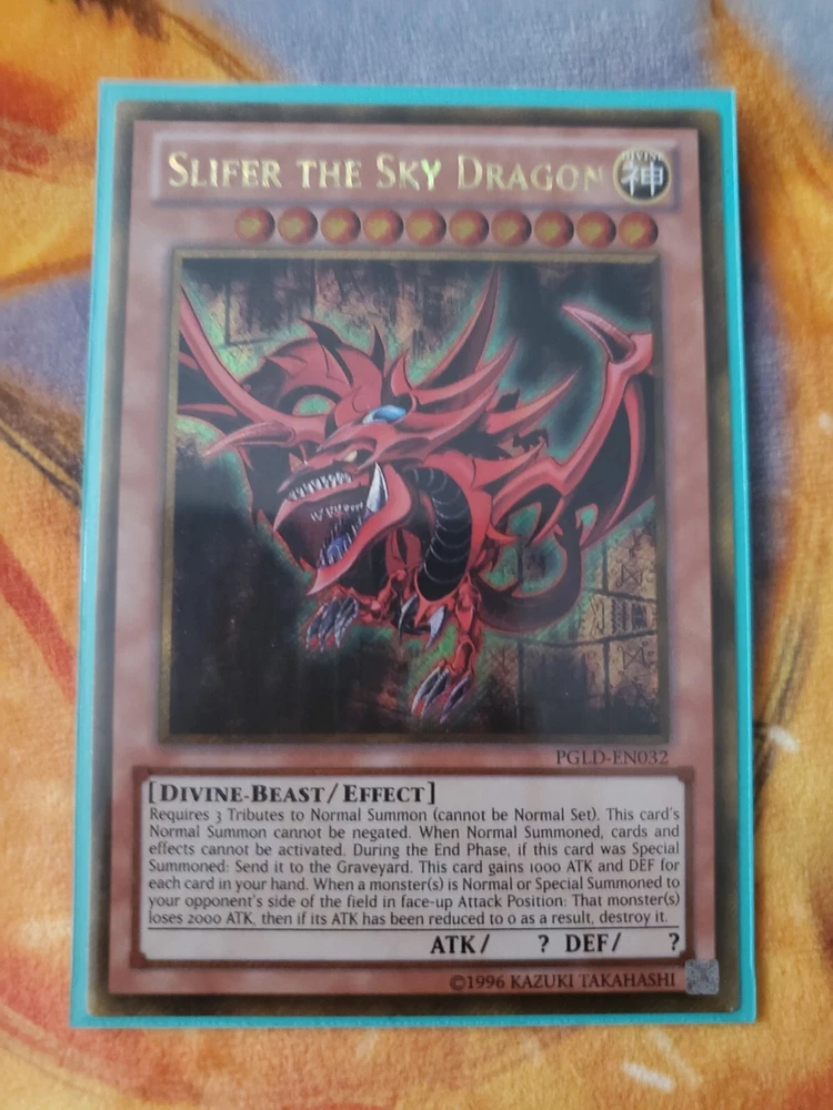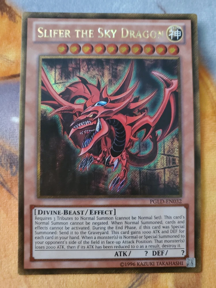 Yugioh Slifer the Sky Dragon PGLD-EN032 Gold Secret Rare Unlimited lightly played. Pictures are of the card you will receive any question or concerns feel free to message me....