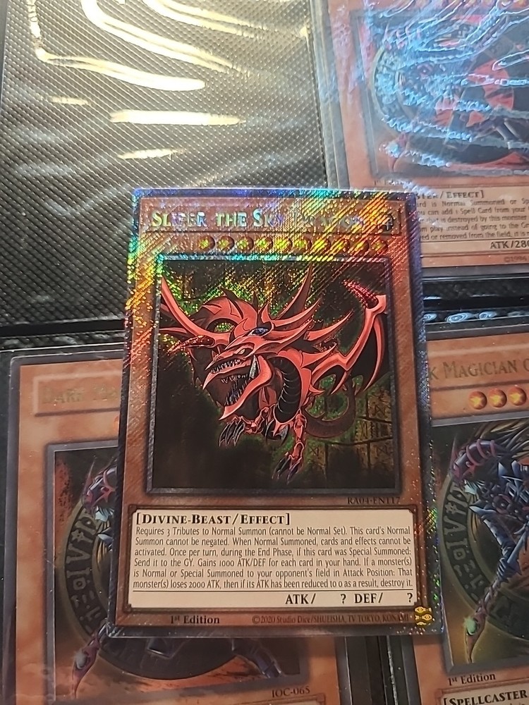 The product is a Yugioh card featuring Slifer the Sky Dragon from the Quarter Century Stampede set. This Platinum Secret Rare card is part of the Yu-Gi-Oh! TCG and manufactured by Konami. It is a highly sought-after collectible card for fans of the game, known for its powerful abilities and rarity within the trading card game community.