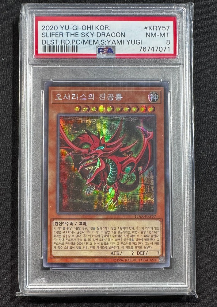 This is a Korean Slifer the Sky Dragon Secret Rare, PSA Graded 8 . It will ship within 2 days of your payment. If you have any questions, please ask before purchasing and we would be happy to help however we can. If ever there is a problem with something you've bought from us Please contact us IMMEDIATELY, BEFORE leaving feedback or opening a case. We ALWAYS fix any and all problems or misunderstandings. We LOVE our customers and strive to please. We are a real brick and mortar store so we pride ourselves on customer service and YOUR COMPLETE satisfaction!