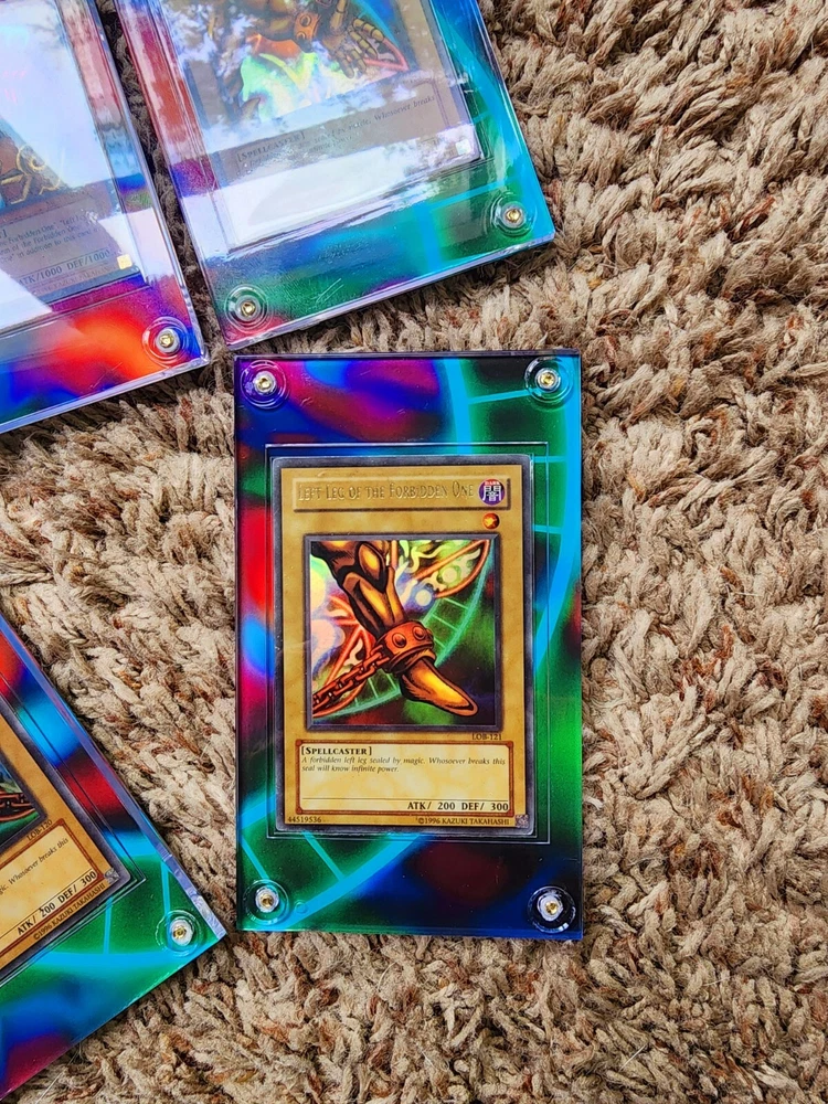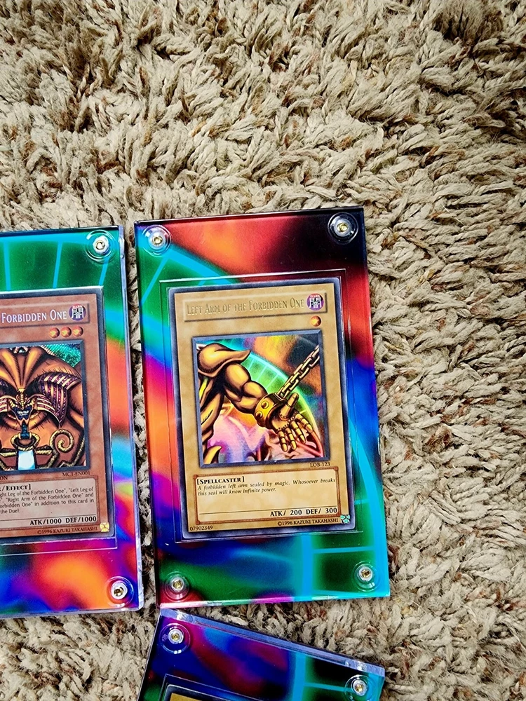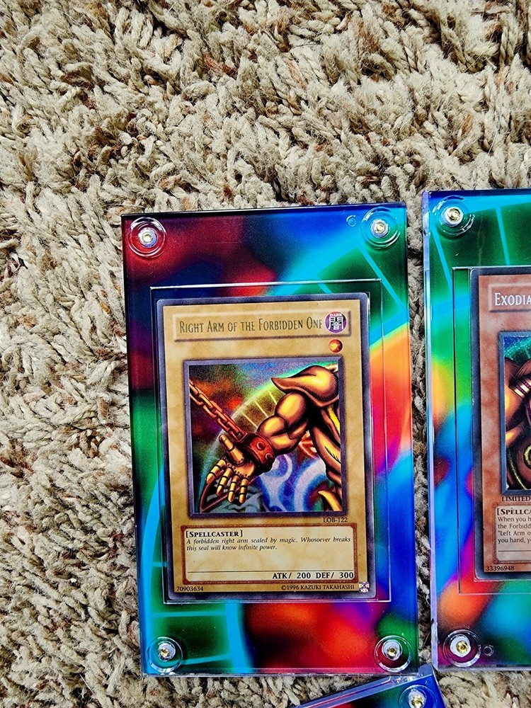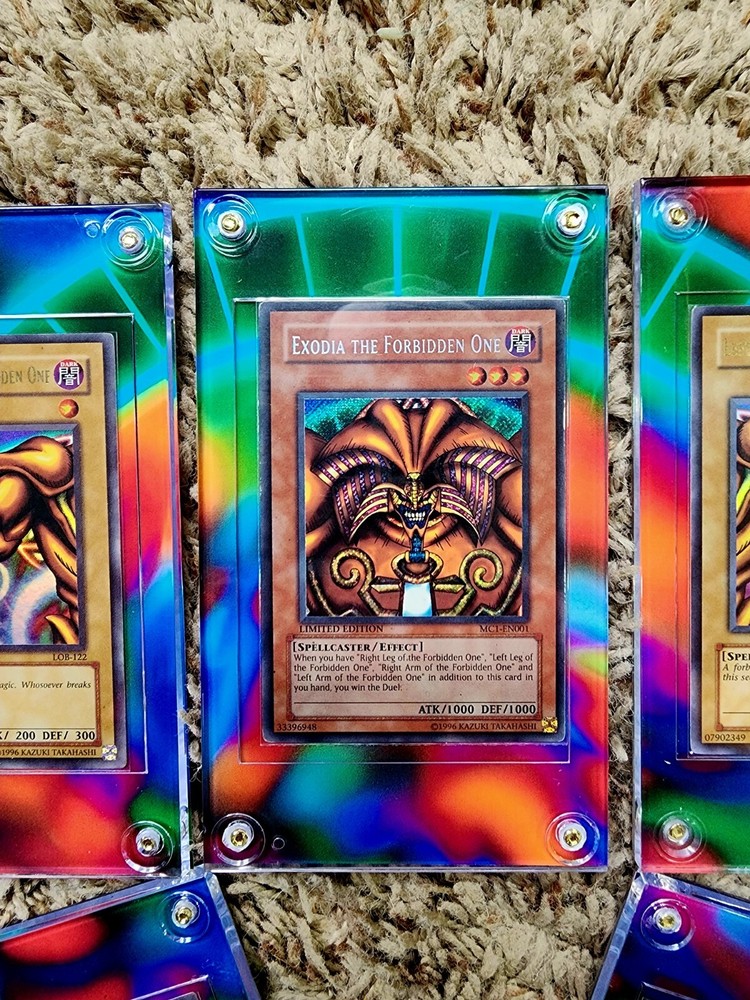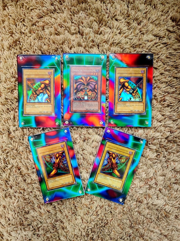 *Yu-Gi-Oh Cards Not included* X5 Yugioh Spellbinding Circle Exodia Custom Cases Custom Yugioh Exodia The Forbidden One cases. Includes the exact cases and custom backgrounds pictured here. Does not include the cards. The custom background is printed on a thick cardstock and makes a perfect extended artwork display of the card. It will come in a brand new official One-Touch Ultra Pro Case that has a recessed pocket for the card so there is no damage to your card! Includes: X5 One-Touch Ultra Pro Screwdown Cases, Custom Backgrounds, perfect fit yugioh card sleeves, and perfect fit case sleeves. Will ship same or next day secured in a small box! Check out all my other custom slabs. Let me know if you want anything custom made for any Pokémon or Yugioh card! I can make a custom bundle at a discount for you if you want multiple. I'm happy to work with you to give you the best price!